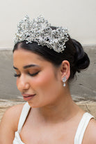 This Rhodium work of art has been delicately and genuinely handmade, with hours of craftsmanship to thoroughly assemble the intricate woven webs of swirling seed pearls and encrusted tiny crystals. If you are looking for a bold statement high-rise crown to add to an elegant bridal dress, Alexandra cannot be ignored.