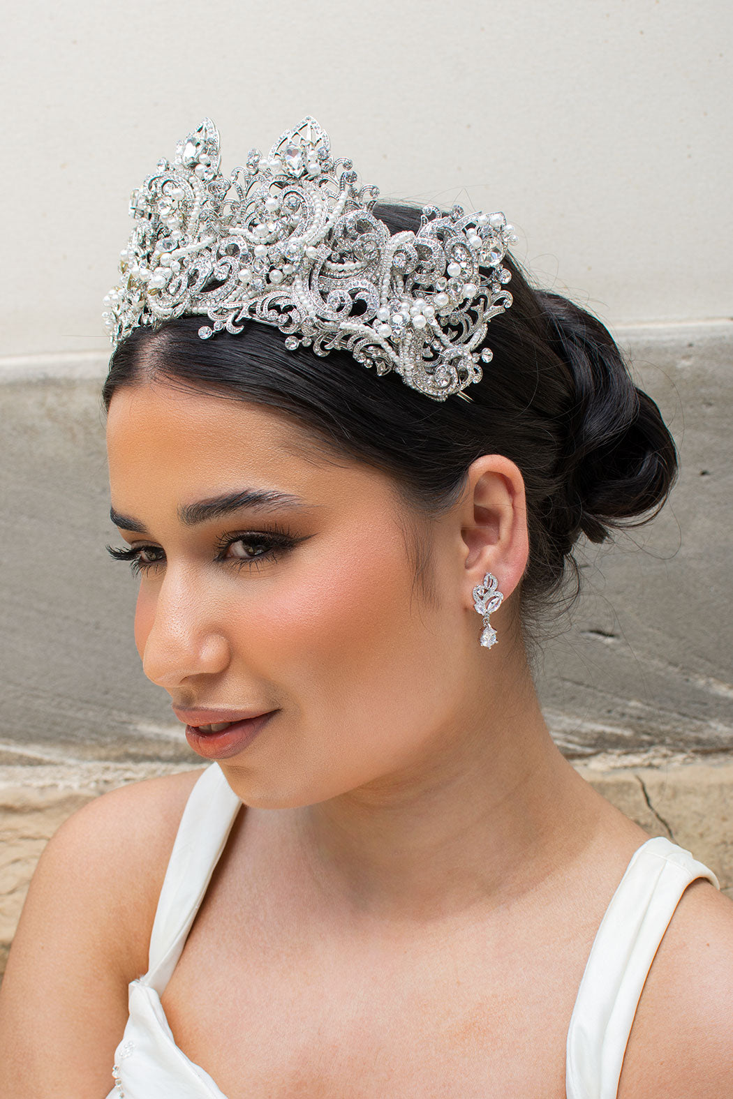 Imagine walking down the aisle in your elegant bridal look, looking at the adoring faces of your loved ones. Wearing the Alexandra Crown your guests, especially groom, will be left breathless by your outstanding beauty and ravishing appearance. The eyes of your loved ones will adore you and your crown for the entirety of your special day. The Alexandra Crown suits all hairstyles up or down, allowing you to choose any bridal hairstyle to go with your complete bridal look.