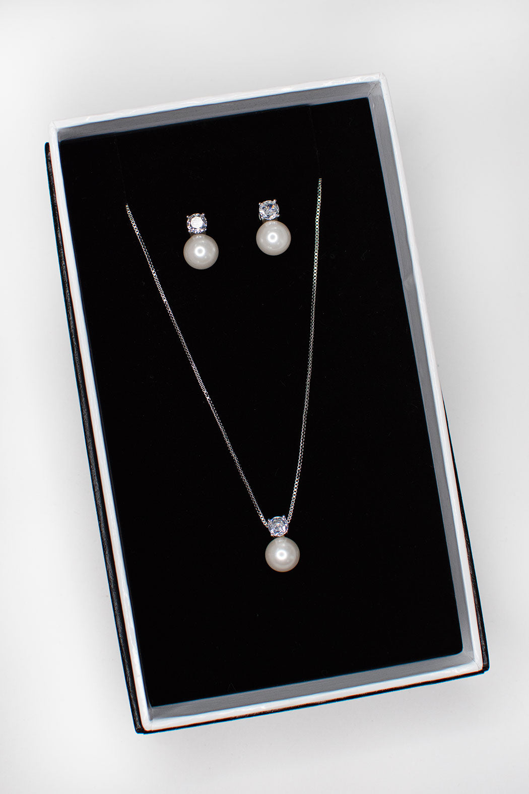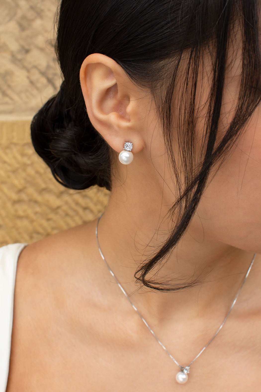 Annie is a classic and timeless earring and necklace set, perfect for the Bride who aspires for an elegant and modern wedding. This pair of perfectly sized pearl and crystal complements all styles of wedding gown and bridal aesthetic. On your special day, the Annie Set is a thoughtful bridesmaids gift for you and your bridal party to wear on your wedding day. Feel the love with Annie on your special day.