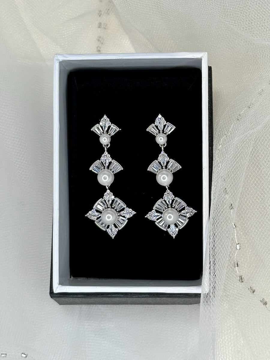 Feel the centre of attention in stylish and unique Aspen on your wedding day. The lovely Aspen is a beautiful tiered Bridal Earring intricately hand set with tiny crystals and pearl centres. Forming a tier the beautiful open back crystals glimmer and glow. The workmanship on this piece is very fine.