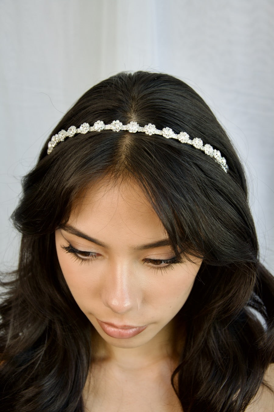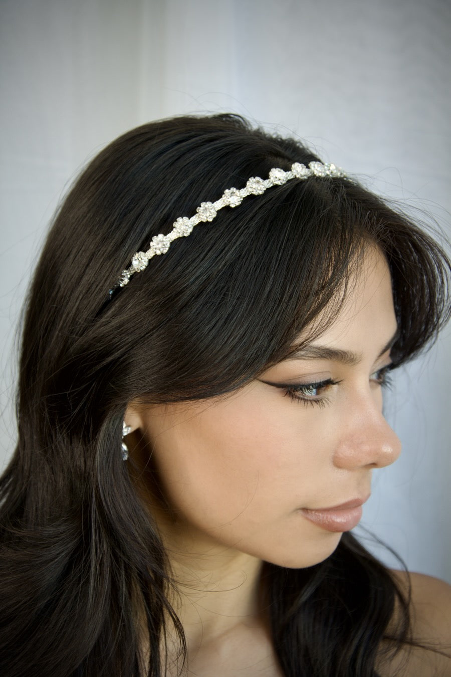 Astrid is that classic perfect headband for the Bride who just wants that extra touch for her Bridal look. Less than a centimetre wide Astrid adds that gleam of beauty to an elegant Bride. Crystals are nestled in a ring of tiny stones on a bright silver band.