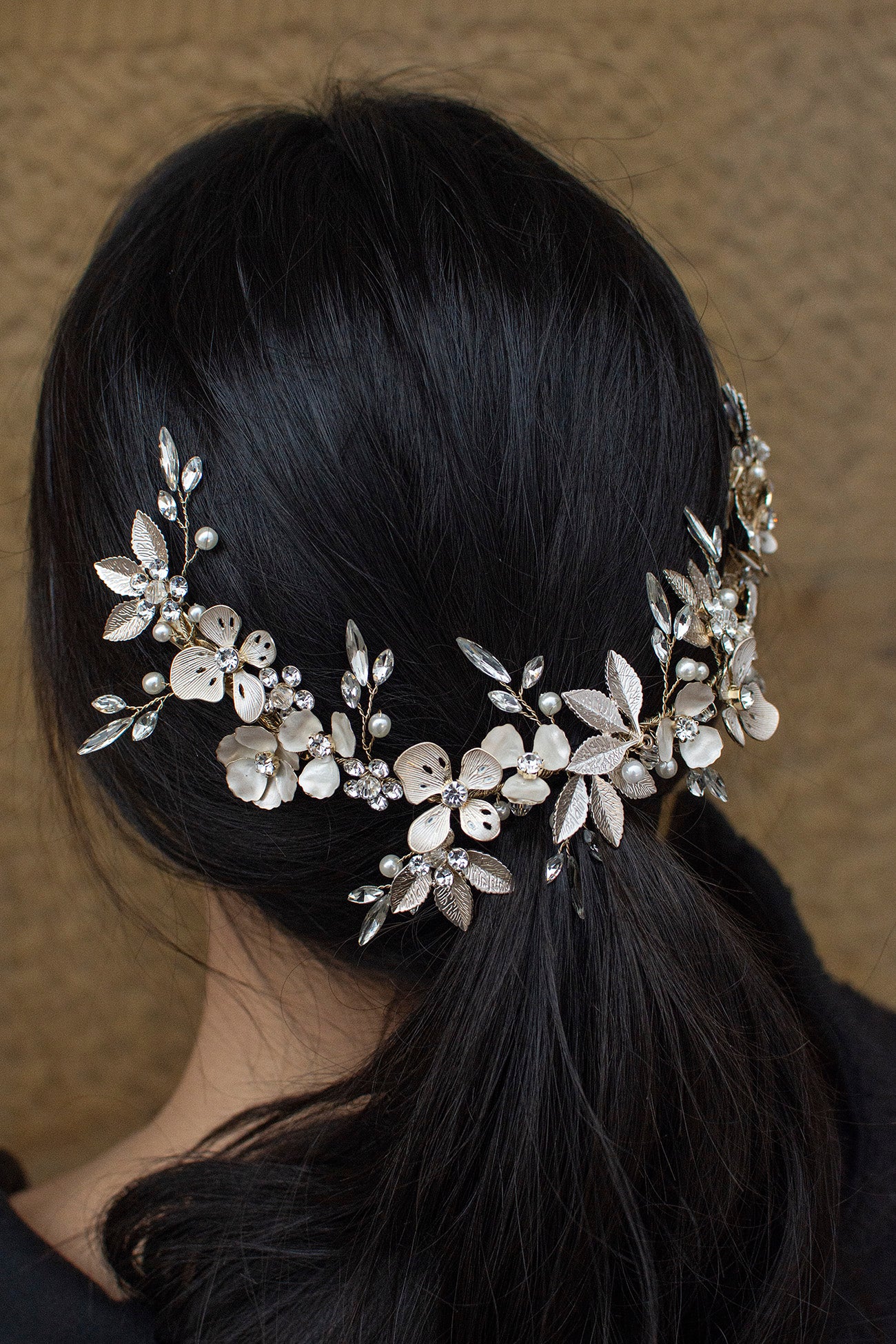 The vine version of the Bianca side comb, Bianca Double is perfect for a look with refined elegance. An array of delicate petals and leaves stretch around to decorate the head with the extra touch of grace and glamour every bride strives for. If you are looking for a hint of sparkle, Bianca is the perfect choice.