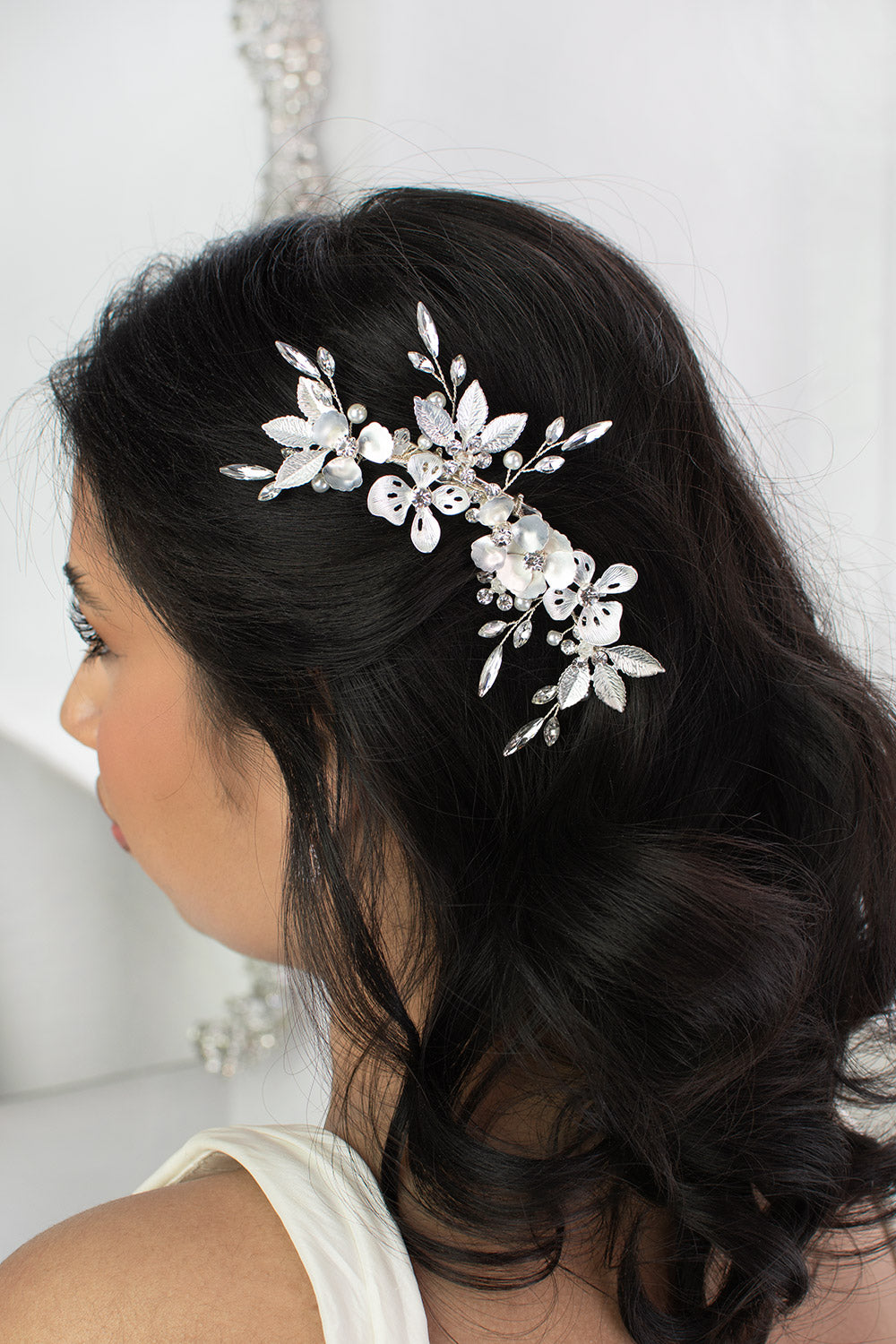 An ethereal side comb, Bianca is perfect for a look with refined elegance. An array of delicate metal leaves and petals with a pearlescent finish extend from the base and decorate the head alongside gleaming crystal sprigs. Bianca is easily adjustable for styling preference and is fitted with a secure clip at the back for a strong and comfortable wear. If you are looking for a hint of sparkle and glamour, Bianca is the perfect choice.