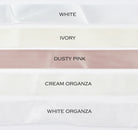 The Cassandra belt also comes in Gold and Rose Gold with the white pearl finish. This belt comes on all our available ribbon colours. White, Ivory, Cream Organza, White Organza, Dusty Pink, Dark Ivory. We have only shown our most popular belt ribbon colours so please contact us for other variations.