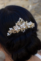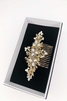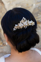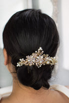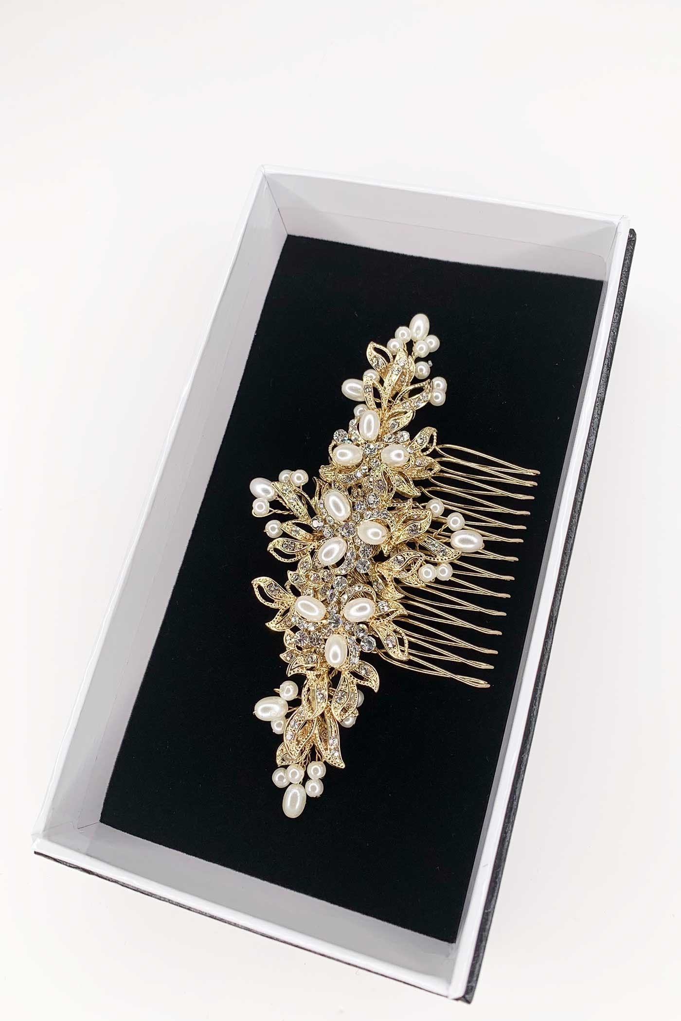 Caterina is a gorgeous curving golden side comb featuring an awe-inspiring display of pearls and crystal-encrusted filigree, putting this piece is in a class of its own. Caterina comes fitted to a hair comb to seamlessly slide into place. So let Caterina lead from the top as you make your way down the aisle on your dream wedding day.