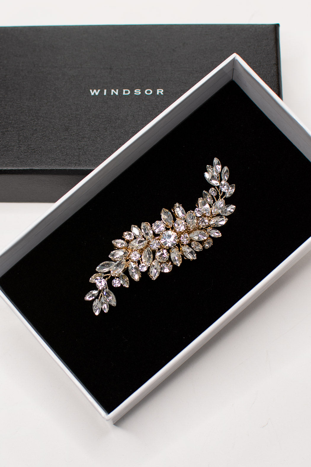 Put your best foot forward as you stride down the aisle in the Celini Side Comb in Gold. A luxurious wave embedded with navette crystal stones, forming an organic shape that is simultaneously classic and modern. With dots of round stones, Celini is a woven beauty of dazzling crystal that catches the eye with the slightest movement. Celini is unique, modern and elegant - perfect for Brides and Bridesmaids alike. Bound with golden wire, Celini's natural shape can be moulded to any hair style easily. Perfect for styling over a bun and at the top of a wedding veil. Let Celini adorn you with crystal and light.