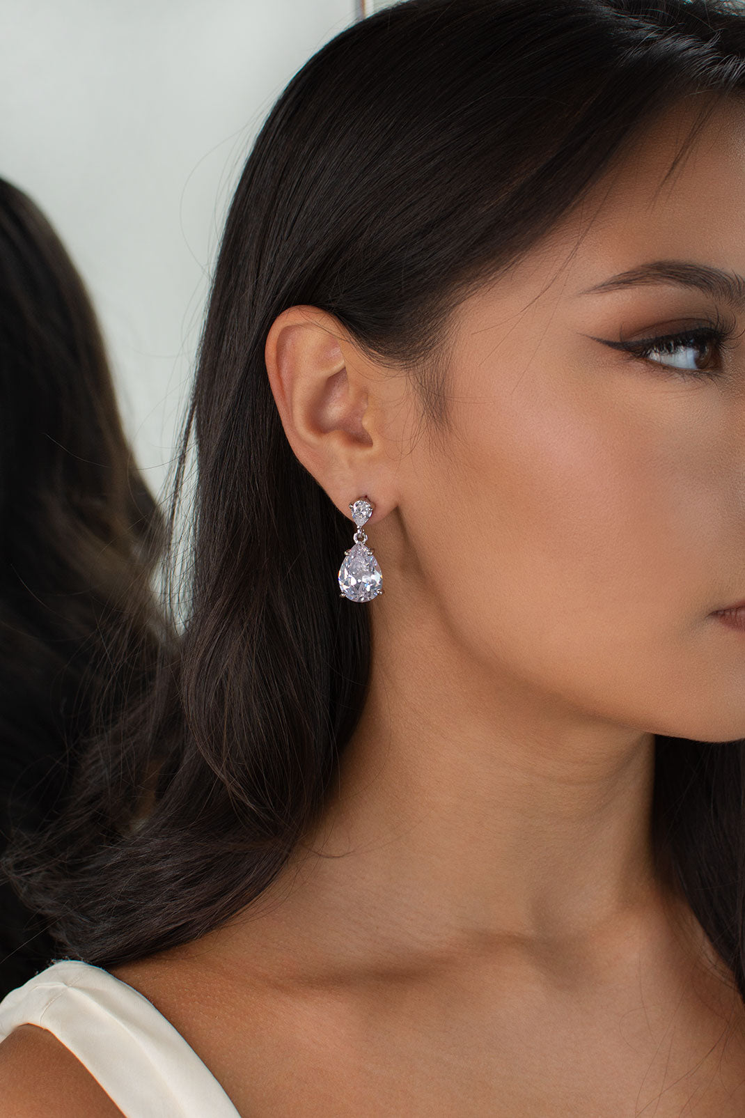 With small and larger twin pear shape stones, this quality Zirconia stone earring has a classic claw setting. With open back to catch the light, Cleo is a lovely high quality pair Bridal earrings in Silver plating with post fittings.