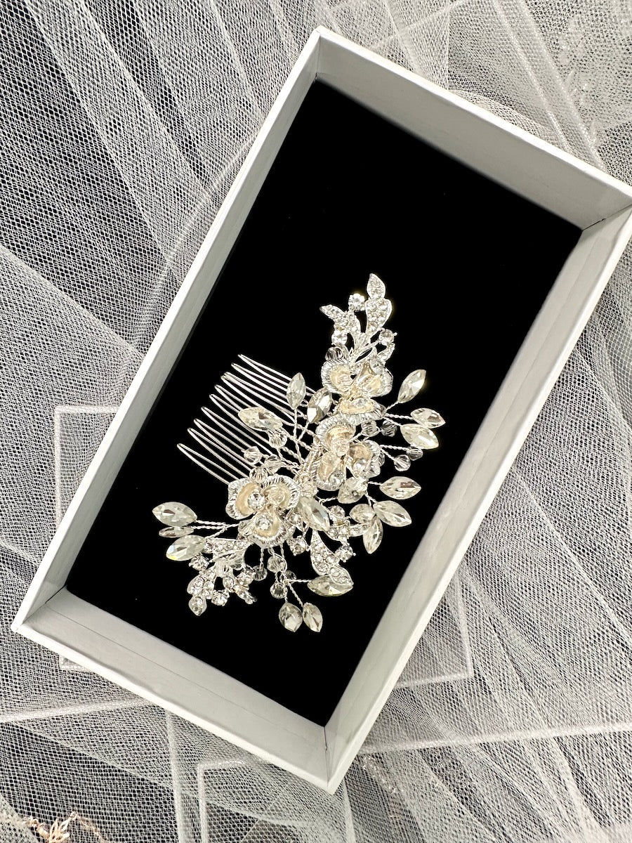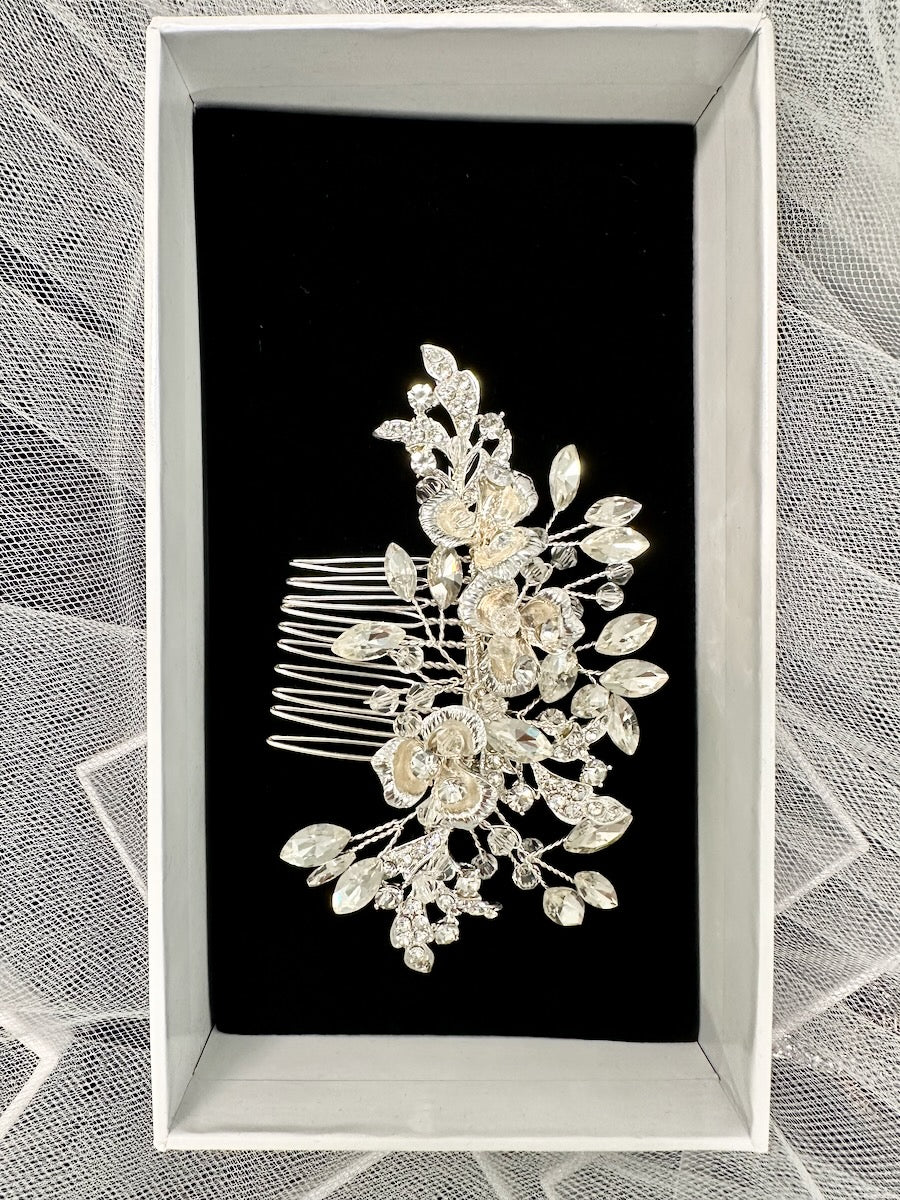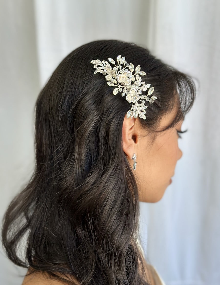 Dakota is a smaller soft side comb for the Bride who needs just a simple small comb for her hair to finish off her look. Three curving flowers hold small clusters of crystals backed by a spray of surrounding stones. Feel Beautiful with the softly sparkling Dakota comb for the side of your head or the back depending on your hairstyle.