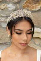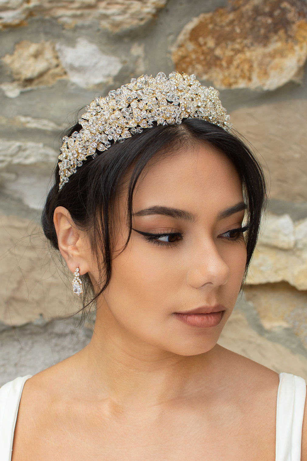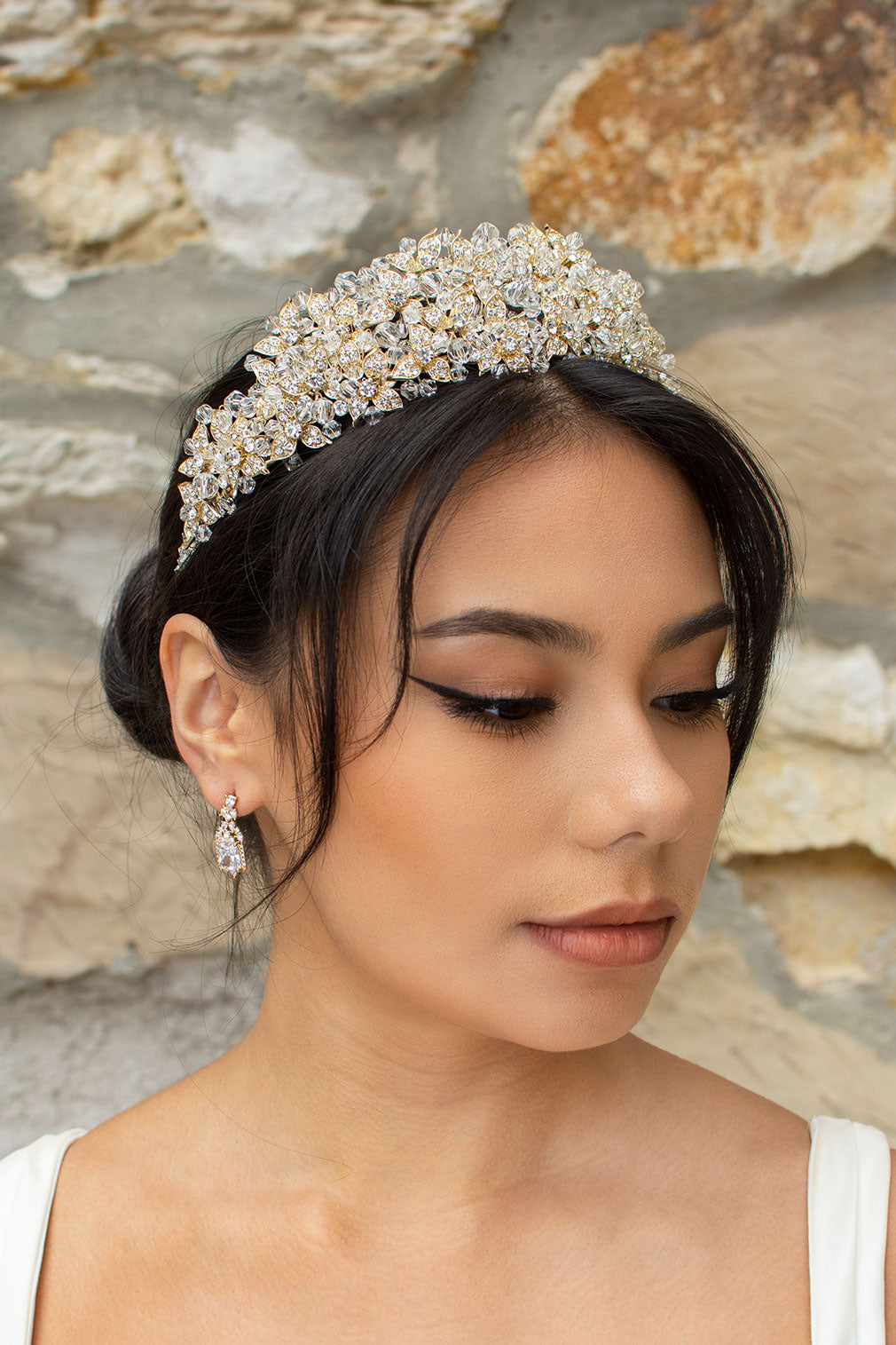 This Classic Magnificent Bridal Tiara is a dream come true featuring a symphony of quality crystal, floral details and pale gold leaves. Edwina Double is sure to be the crowning glory of your big day and make you look and feel wonderful. Edwina is easily reshaped so you can adjust the shape to suit your style because of the special headband we use makes it very comfortable to wear. A lovely and elegant bridal tiara encrusted with lovely clear crystals Edwina is all about exquisite crystal embellishment. Edwina is the good luck charm you’ll want to be wearing as you float down the aisle in front of so many happy admiring glances.