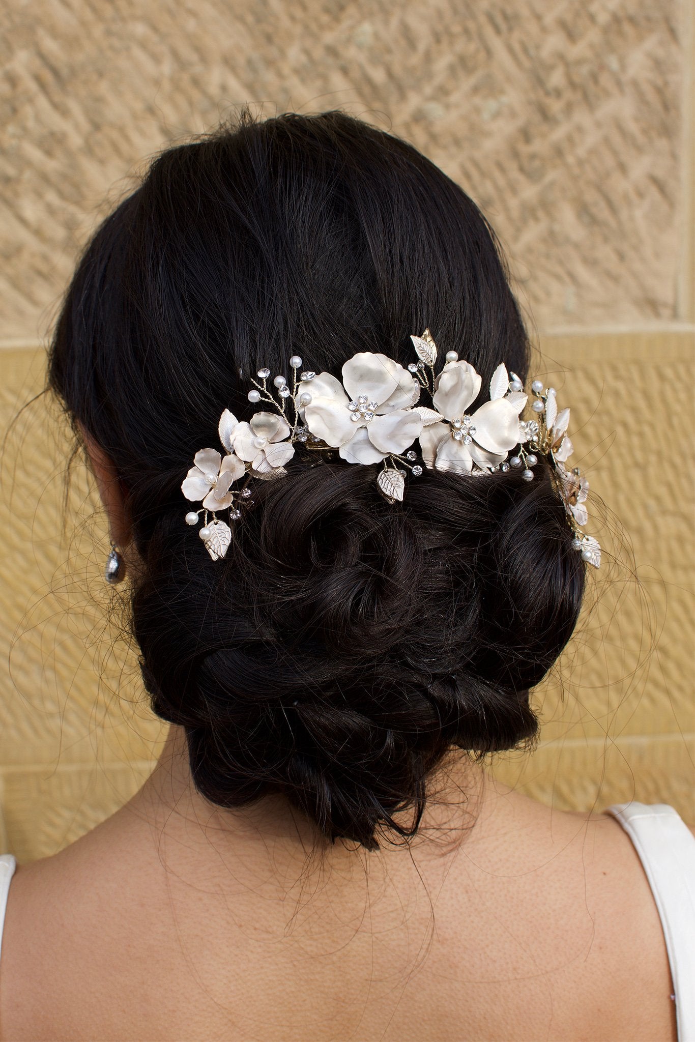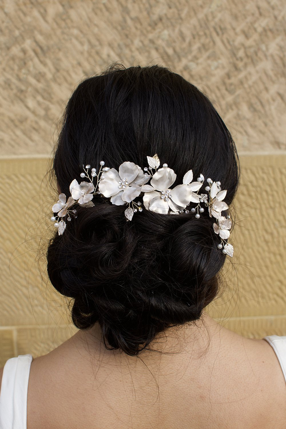 The flowers are made from very thin coated brass. Light as a petal, the Eve flowers hold with a strong clip fastening to guarantee comfortable wear all day long. The Eve flowers can be worn as a short vine across the back of the head, or worn in a bohemian style side comb at the front of the head.