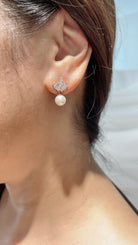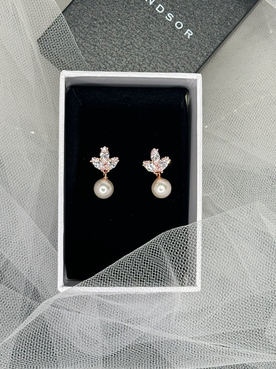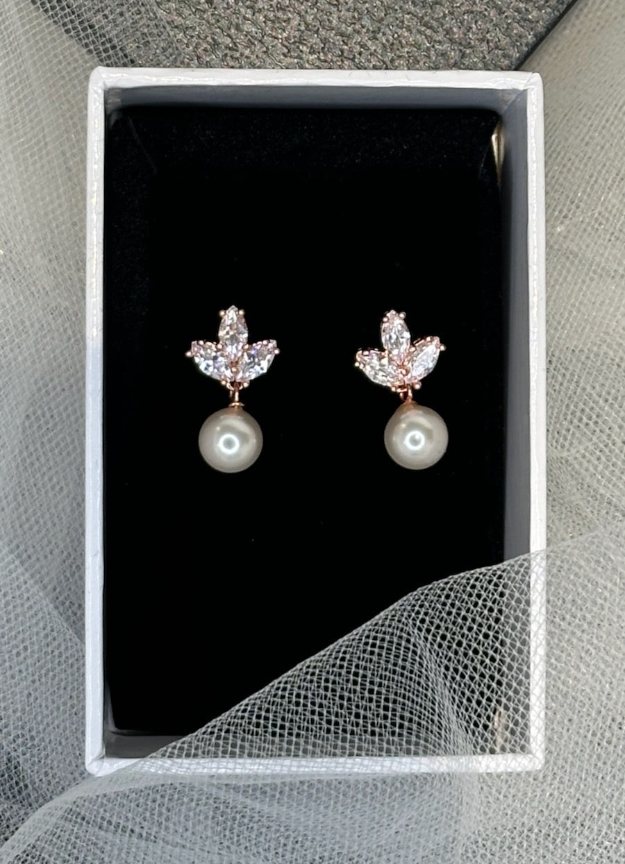 Frankie is a simple yet stunning smaller earring made with a triple cluster of navette-shaped stones that shine above Frankie's beautiful round pearl. For the Bride wishing for a delicate finishing touch to their look or is looking for the perfect gift for their Bridesmaids, Frankie is the ideal choice. Look elegant and lovely as the perfectly finished Bride on your wedding day.