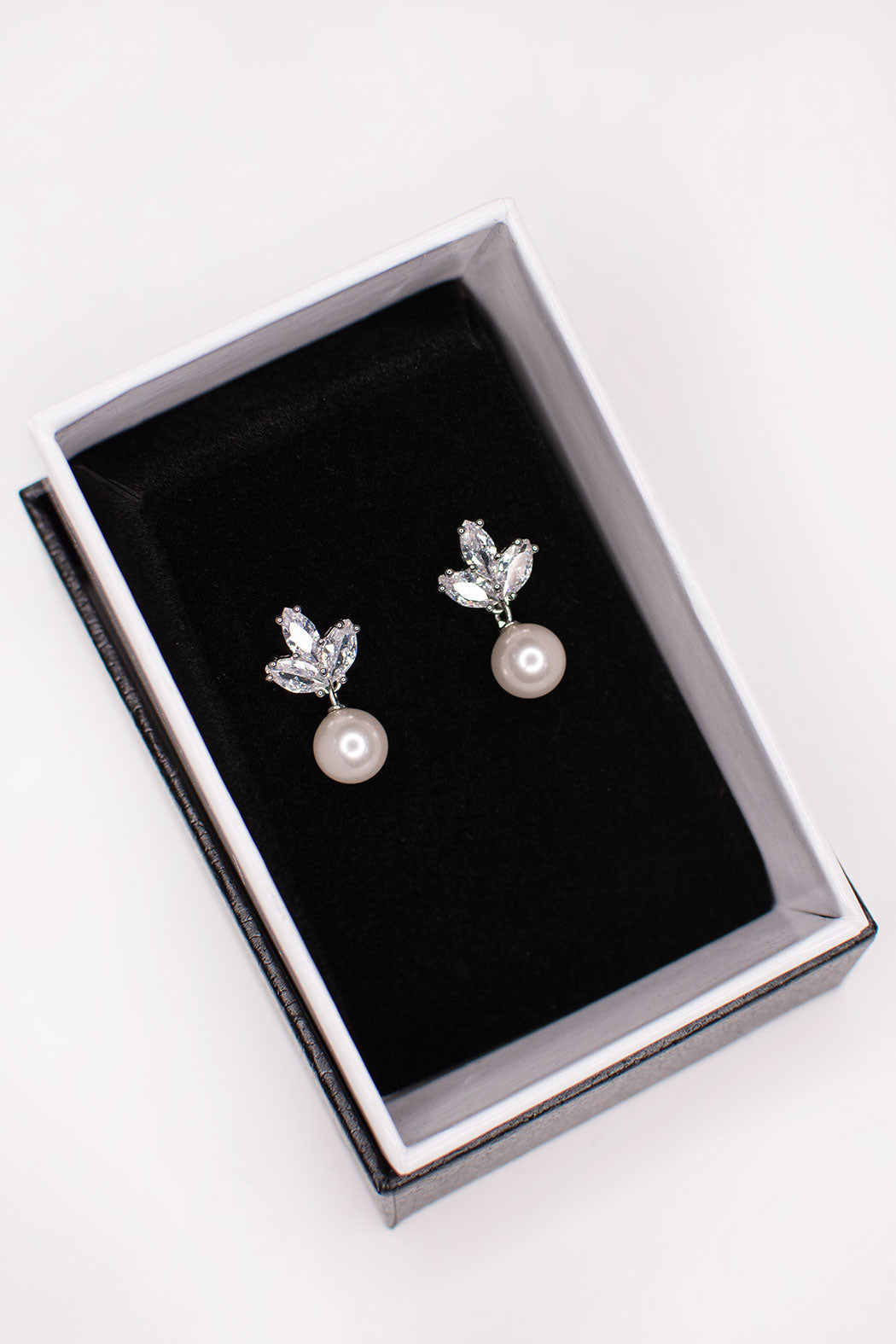 Frankie is a simple yet stunning smaller earring made with a triple cluster of navette-shaped stones that shine above Frankie's beautiful round pearl. For the Bride wishing for a delicate finishing touch to their look or is looking for the perfect gift for their Bridesmaids, Frankie is the ideal choice.