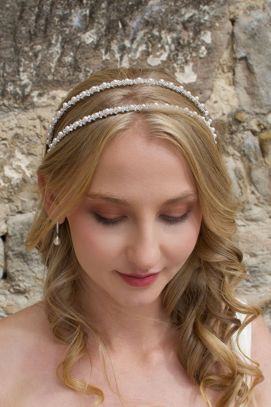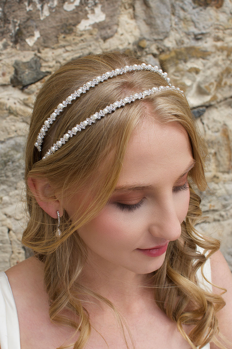 Genevieve is a classic, beautiful two-row bridal headband. The twin rows of silver clear crystals and pearls are bound onto the light and bendable frame, allowing this piece to mould to the shape of your head for a comfortable fit. Genevieve is modern yet glamorous and will brighten any bridal look with its' simple and pure elegance.