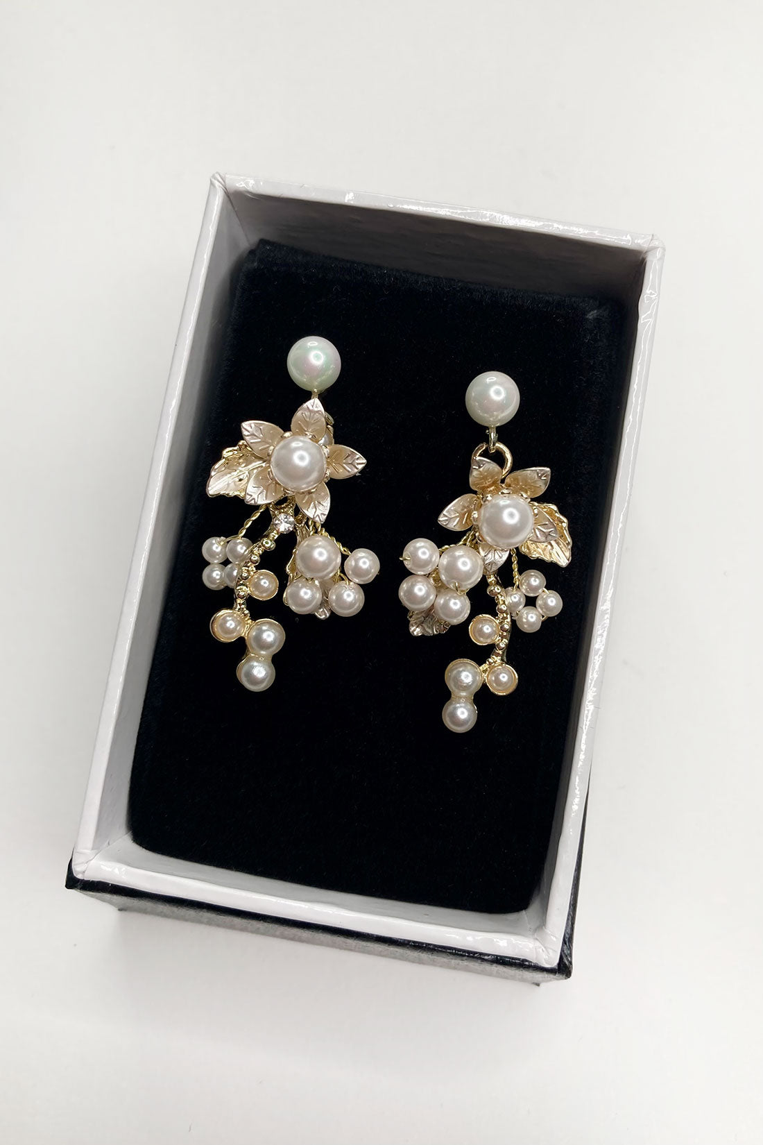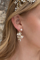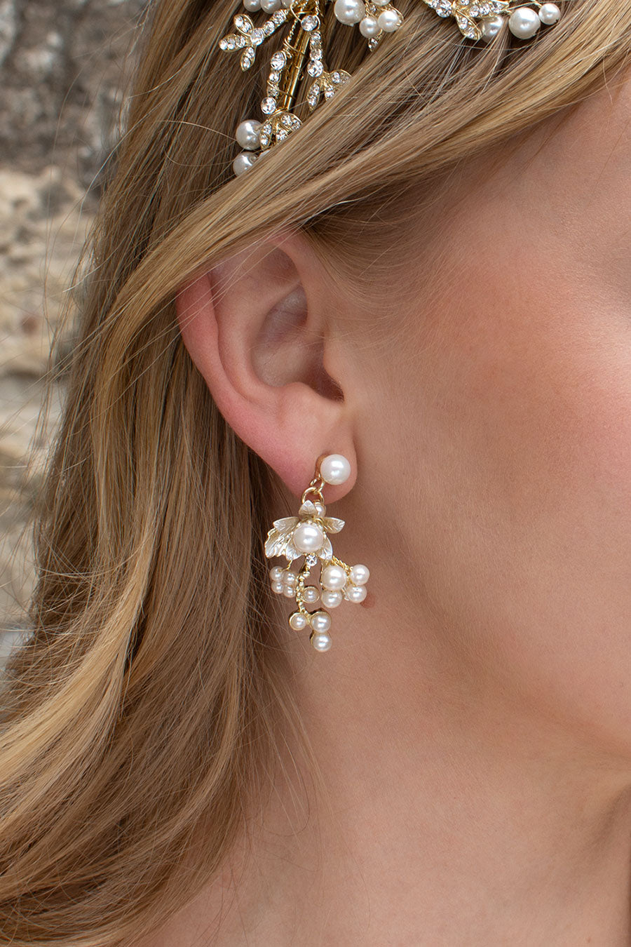 Our Georgie Earring is a pearl wonder with pale gold floral features that fall curvaceously to frame the face. A small flower is dotted with a rounded pearl as the main motif of the arrangement, picking up on matching details in both our Elizabeth in Pale Gold and Carmella in Pale Gold Bridal headpieces. Georgie is a fantastic earring to wear as a singular statement or to match with an array of our Pearl Jewellery. Georgie is easily wearable all day weighing only 5 grams and is 4cm long by 2.5cm wide. Match Georgie with one of our Pearl Headbands, Crowns, Side Combs or Vines in any of our three colours- Georgie in Silver, Pale Gold or Rose Gold. A perfect addition to your pearl bridal look and an amazing gift to bridesmaids.