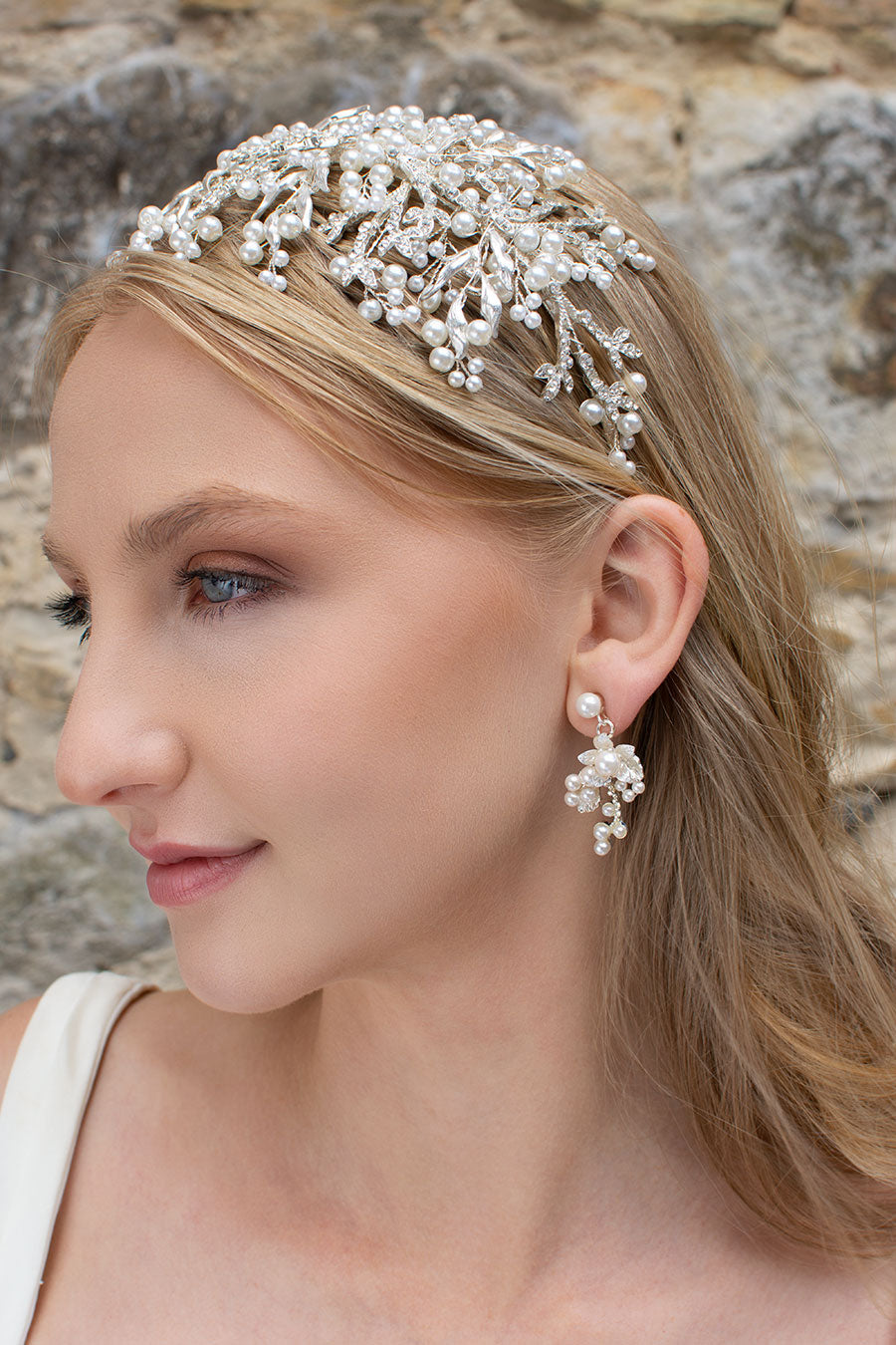 Our Georgie Earring is a pearl wonder with silver floral features that fall curvaceously to frame the face. A small flower is dotted with a rounded pearl as the main motif of the arrangement, picking up on matching details in both our Elizabeth in Silver and Carmella in Silver Bridal headpieces. Georgie is a fantastic earring to wear as a singular statement or to match with an array of our Pearl Jewellery. Georgie is easily wearable all day weighing only 5 grams and is 4cm long by 2.5cm wide. Match Georgie with one of our Pearl Headbands, Crowns, Side Combs or Vines in any of our three colours- Georgie in Silver, Pale Gold or Rose Gold. A perfect addition to your pearl bridal look and an amazing gift to bridesmaids.