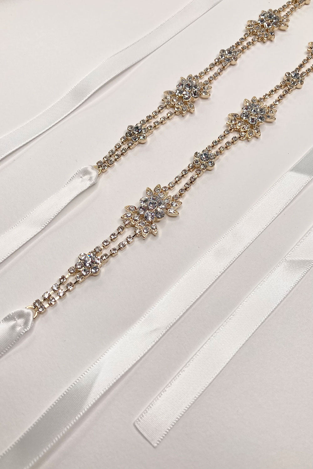 The Gisele is a gorgeous narrow Pale Gold belt (1.5cm wide). It features a 60cm crystal-encrusted antique style motif . This design is available on a narrow diamond white 3m ribbon with the ends of the ribbon trimmed with diamanté stones, this design is a true bridal beauty. All Chain versions of Giselle are not available in gold only Silver and Rose Gold.