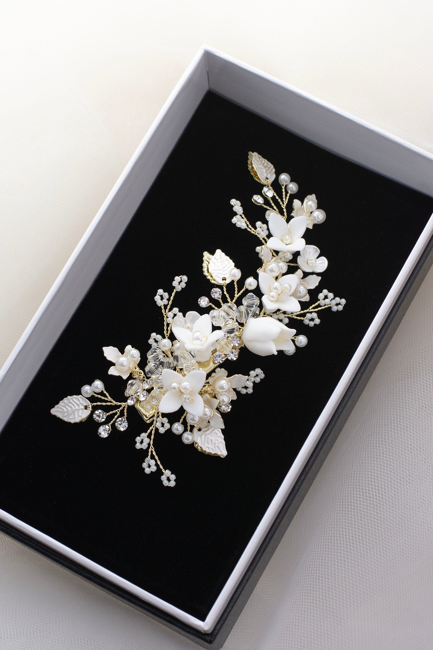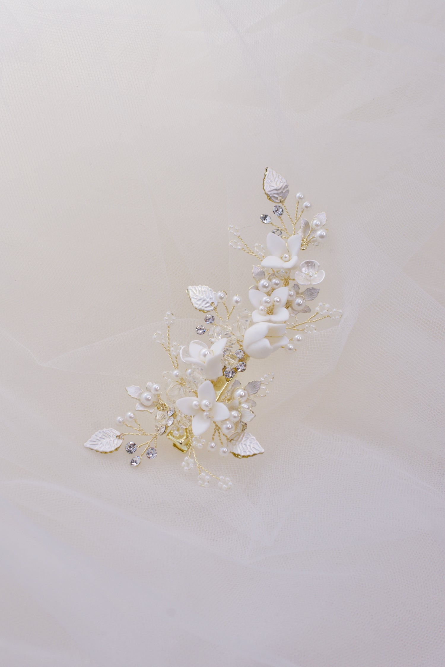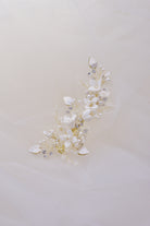 Put your best bridal foot forward with the Harlow Clip, a most delicate porcelain wonder. With all the intricacies of a growing vine and the softness of a petal, let Harlow grow along the back of the head. With feather-like qualities, Harlow gently weaves itself with elegance and glamour. Fitted with a strong clip at the back, Harlow is easy to rest over the top of a veil and wear all night long. Let Harlow shine with you on your special day.