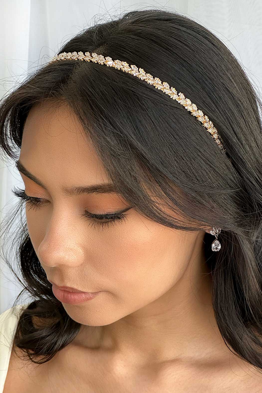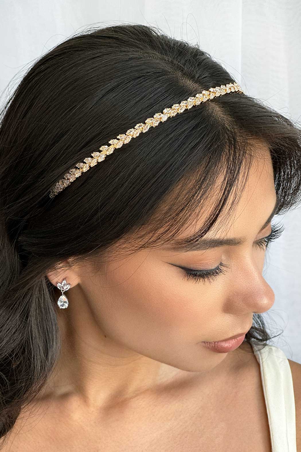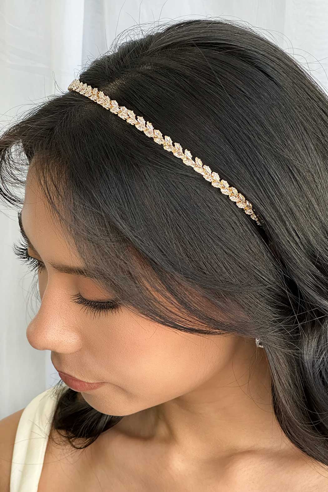 Hazel is a beautiful single row headband encrusted with gleaming navette-shaped crystals that stretch the length of the band to give a modern luxury look. The high quality eye-shaped zirconia stones are individually claw set in cups that stop short to reveal the headband's frame.