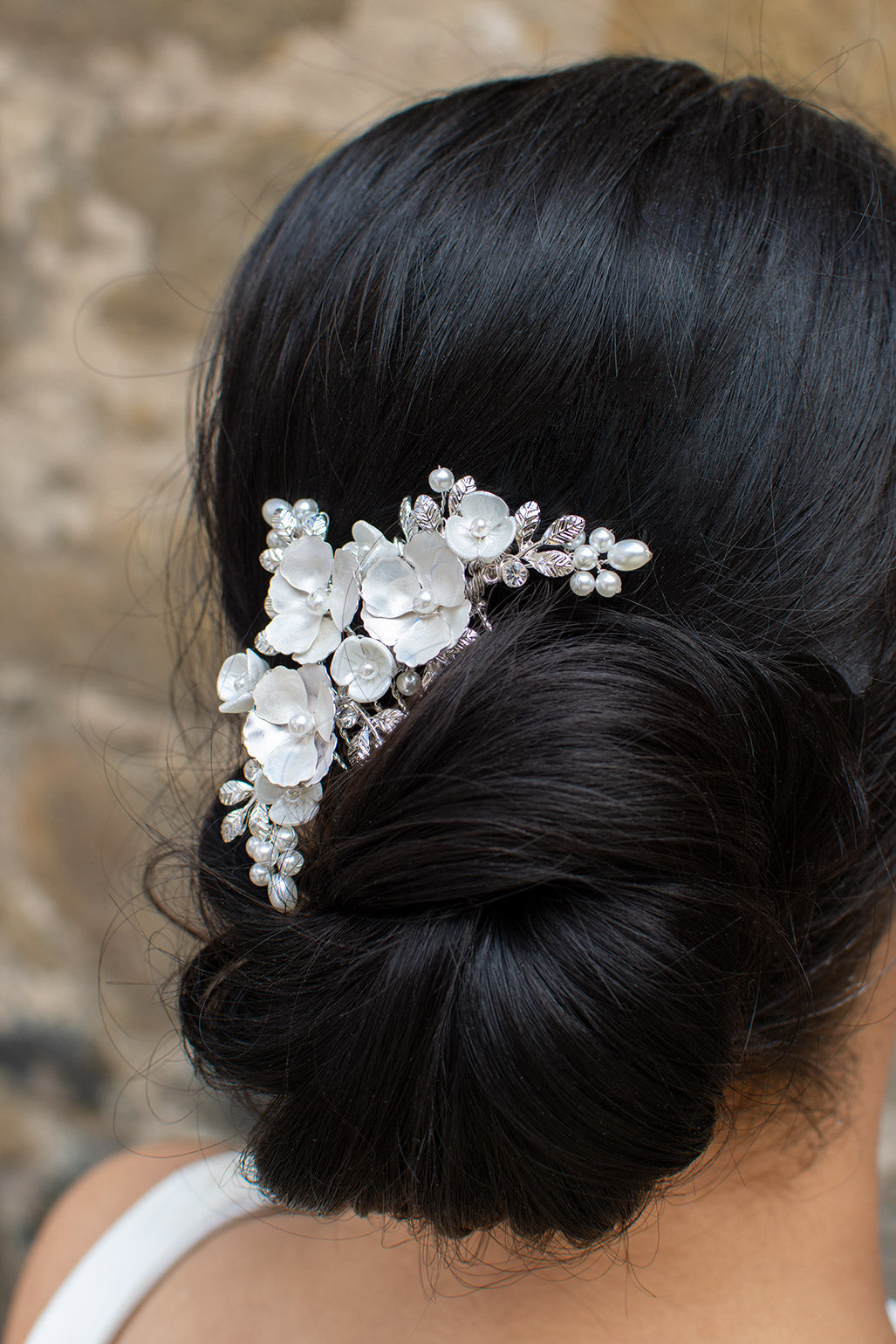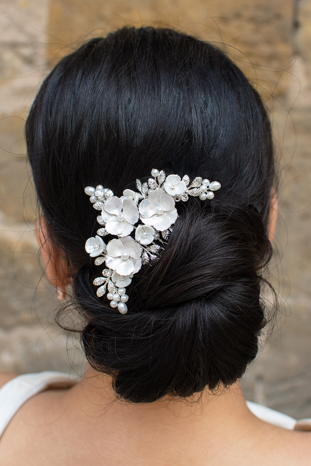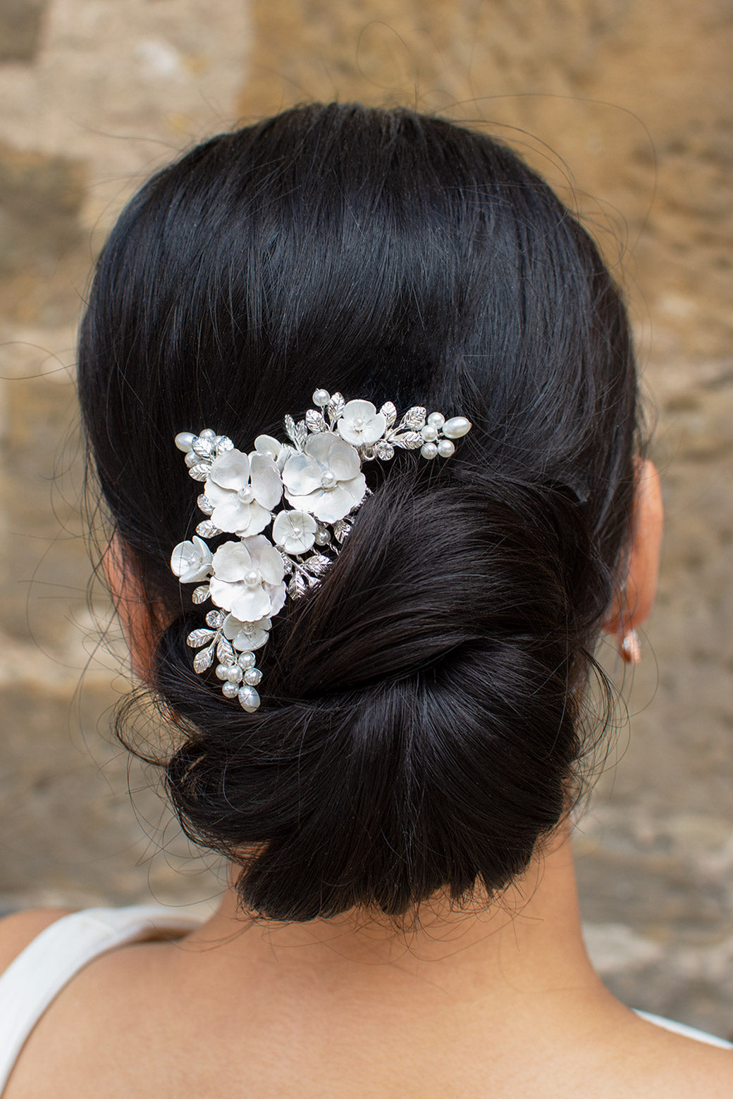 A beautiful budding beauty, Iris is a small yet stunningly detailed headpiece. Complete with a comb fitting, Iris features three delicate metal flowers hand-painted with a pearlescent white silver finish coupled with an array of gorgeous pearls. Similar to our Ava Side Comb, Iris is a downsized version and is perfect for brides, bridesmaids and flower girls alike.