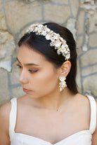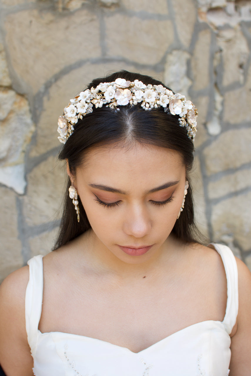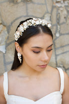 Octavia is a beautiful raised floral headband decorated with bundles of delicate metal leaves, ceramic flowers and petals surrounded by crystal and pearl sprigs. Octavia's ornate and unique design features a gently raised band of flowers, forming a soft arch. Octavia is the perfect match for white lace bridal looks as the white ceramic flowers and finely painted metal flowers pick up on the patterns and intricate details. One of our most popular bridal headbands, Octavia is lightweight and easily adjusted for individual preference and comfort allowing for a comfortable wear all day long. The gold colour used is a little more yellow.