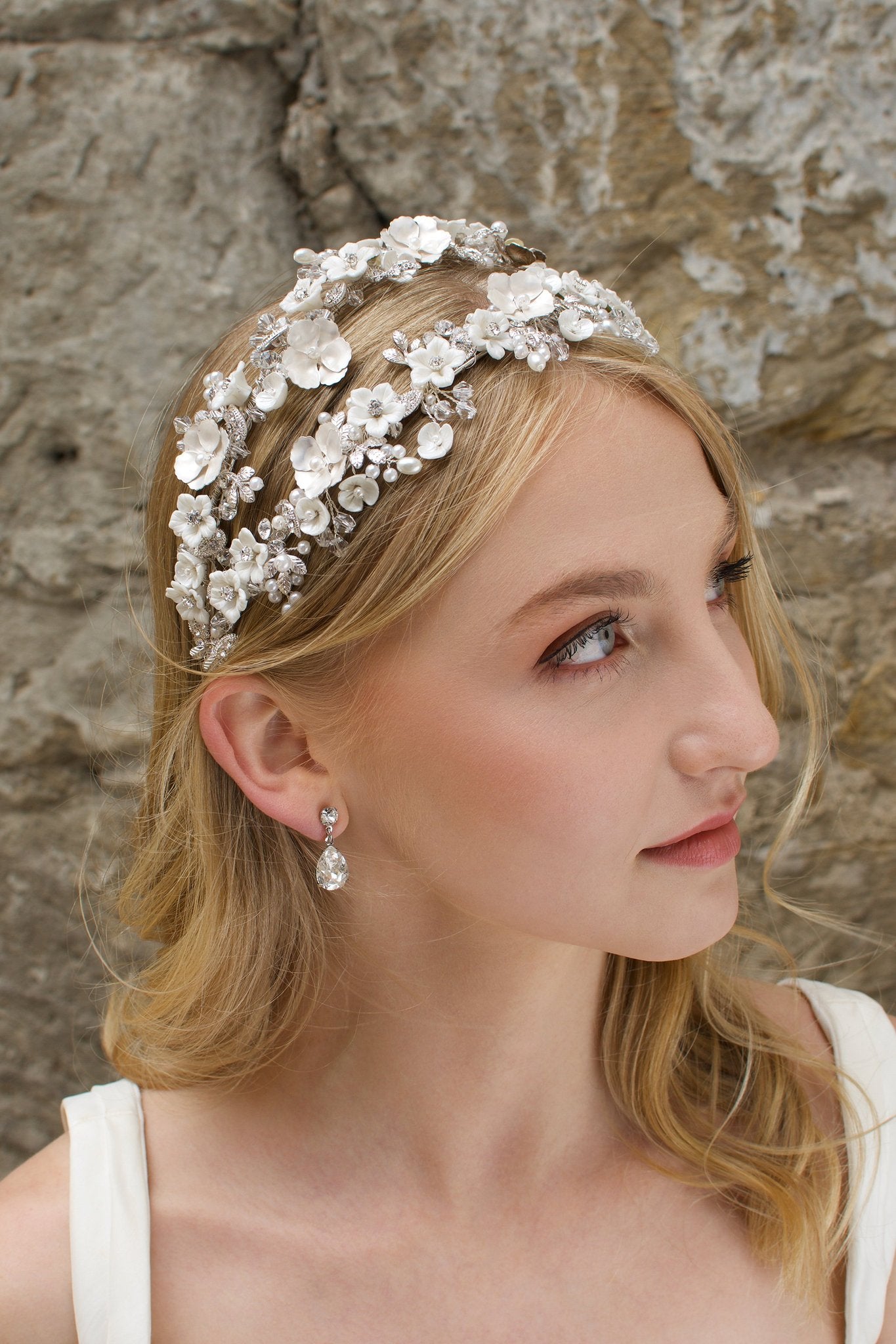 Ophelia is a double row headband featuring small ceramic flowers mixed with fine painted metal flowers. This gorgeous design is the ultimate floral fashion statement for the garden wedding of your dreams. Lightweight and easily adjusted for individual preference and comfort, you’ll be wearing this headband all day long. This is a lovely floral design matching perfectly with many modern floral Wedding dresses. Ophelia is made with a bendable band allowing you to adjust the two rows closer or further apart. Ophelia is also available in gold.