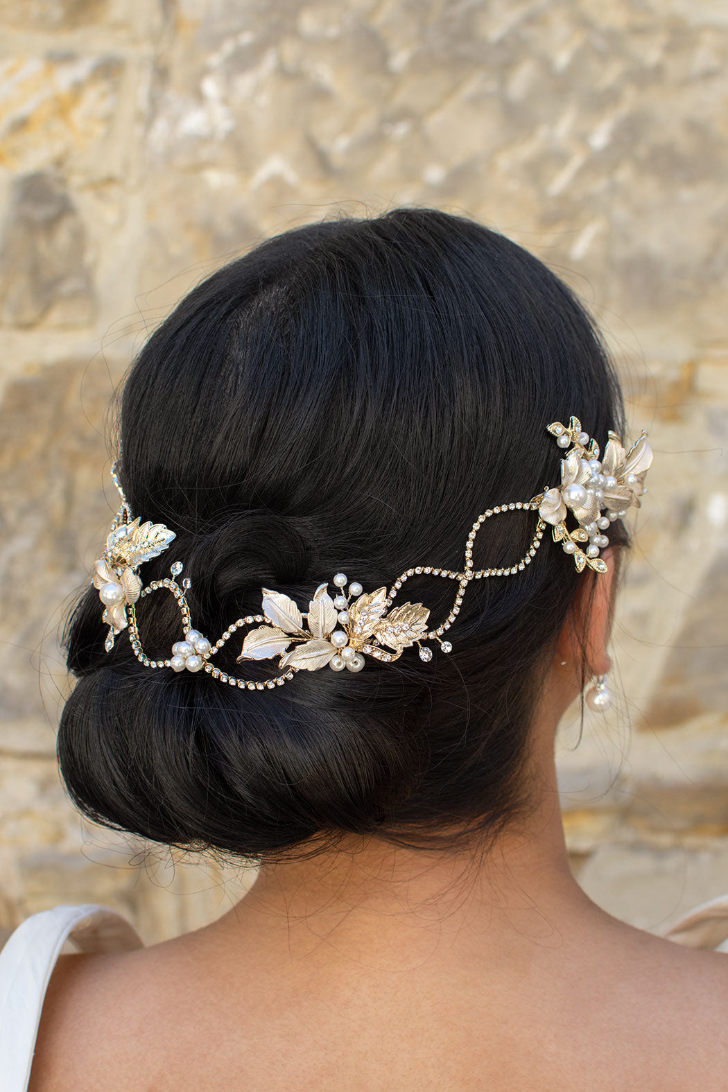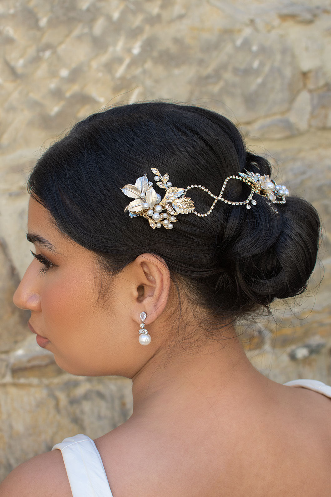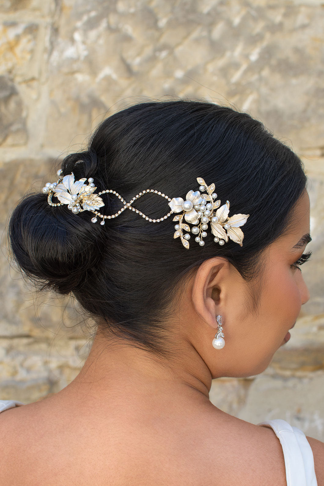 Our Peoni bridal vine is the essence of charm and elegance. This stunning design features motifs of polished flowers and leaves subtly embellished with pearls and crystal beads. Always picture perfect, Peoni will have you looking florally stunning as you make your way down the aisle.