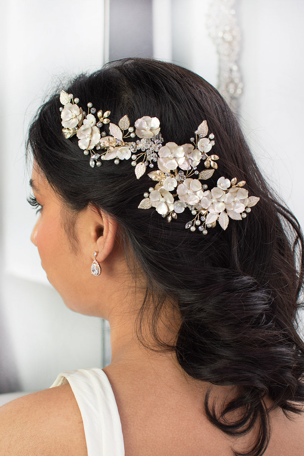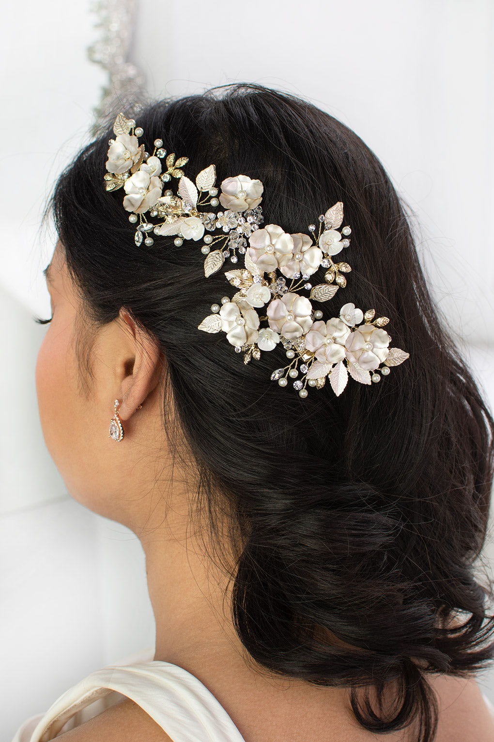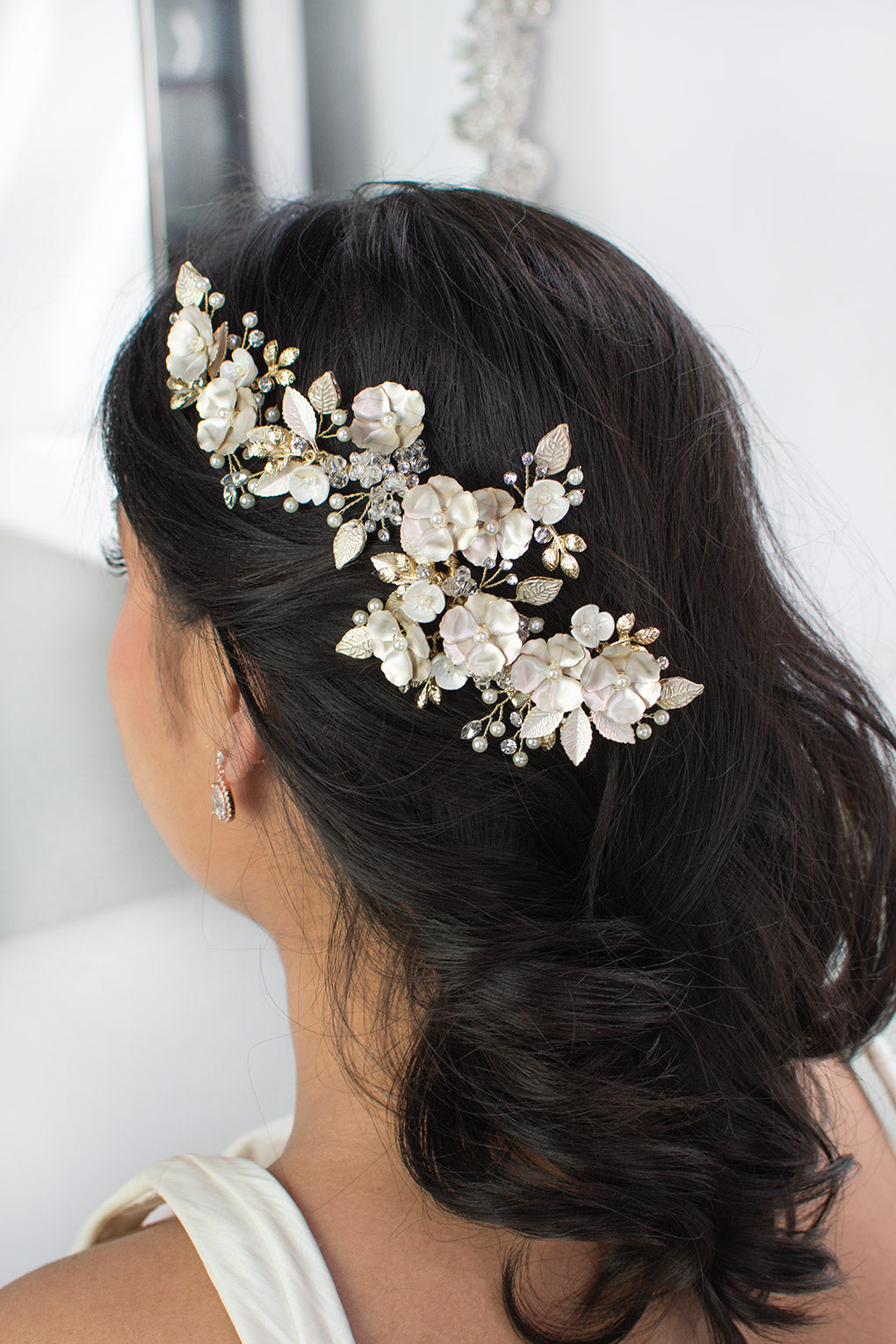 Our spectacular Siena is a radiant and soft large floral side comb that beautifully adorns the side of the head. Reminiscent of living roses, Siena is embellished with tiny pearls, crystals, small detailed leaves and flowers. Painted with a pearlescent finish the delicate flowers and leaves give a soft glow and are an amazing accessory to complete your bridal look. Siena is easily adjusted for individual style preference and is complete with clips to allow for a secure and comfortable wear.