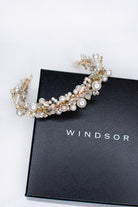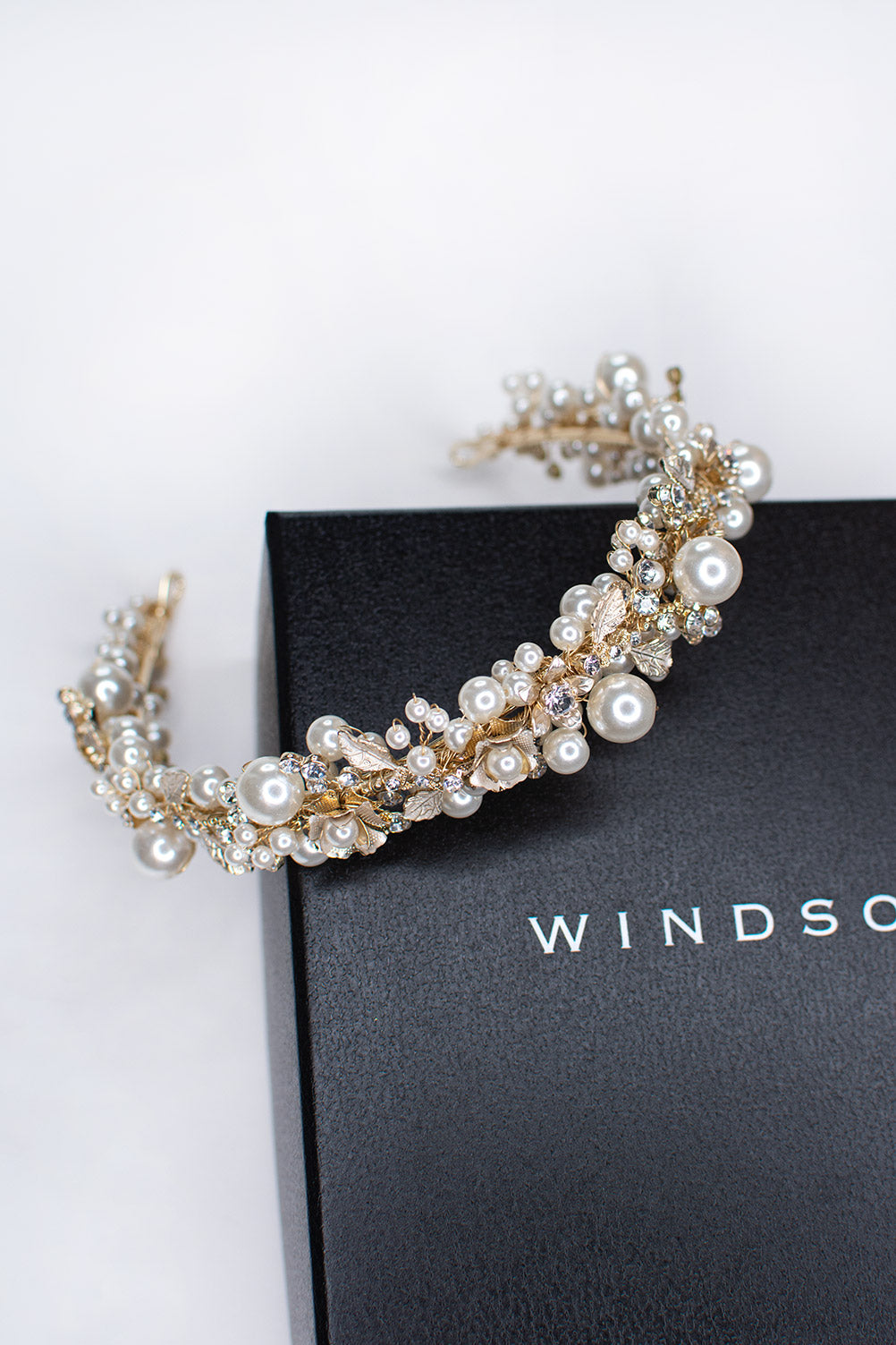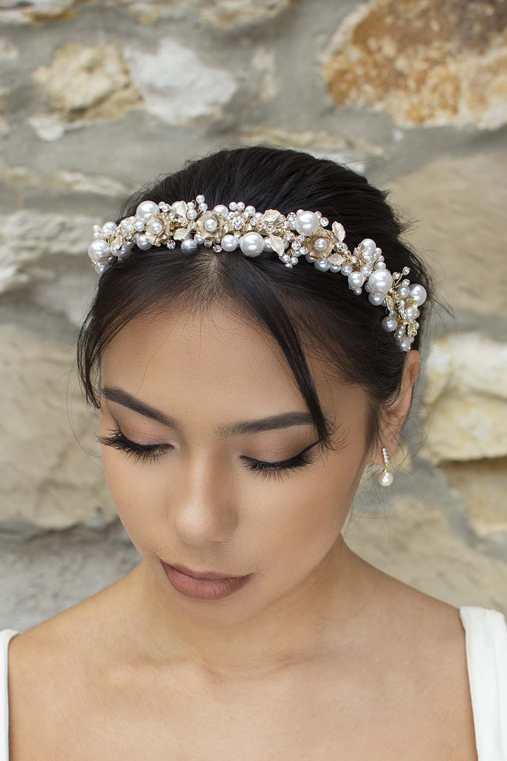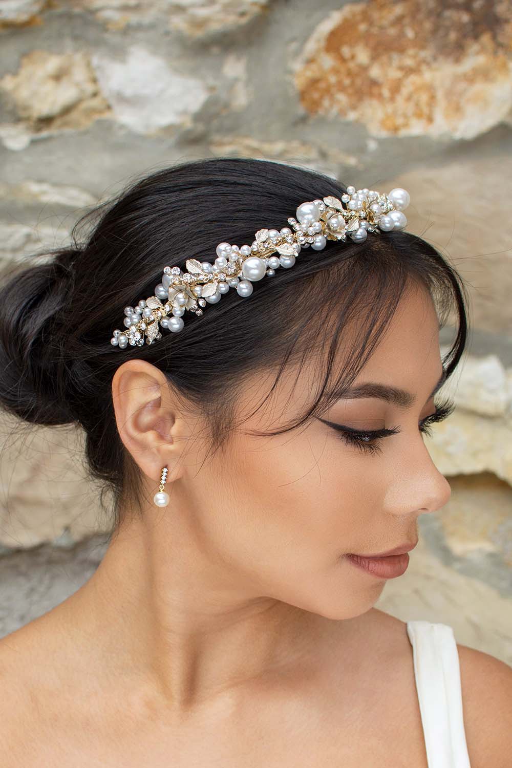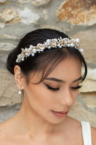 Wondrous Stella, an amazing Gold Pearl Headband that illuminates the room. Feel like the most exquisite bride wearing a piece that has been handcrafted with lustrous pearls and dazzling crystal stones. With subtle flower motifs, Stella is like a charming garland of pearls and leaves made with intricate detail. Stella is perfect to wear for long periods of time, causing no pain or headaches due to its bendable nature. Soft and easy on the head, Stella is suitable for a range of bridal hairstyles. Be the bride you've always dreamed of being with Stella.
