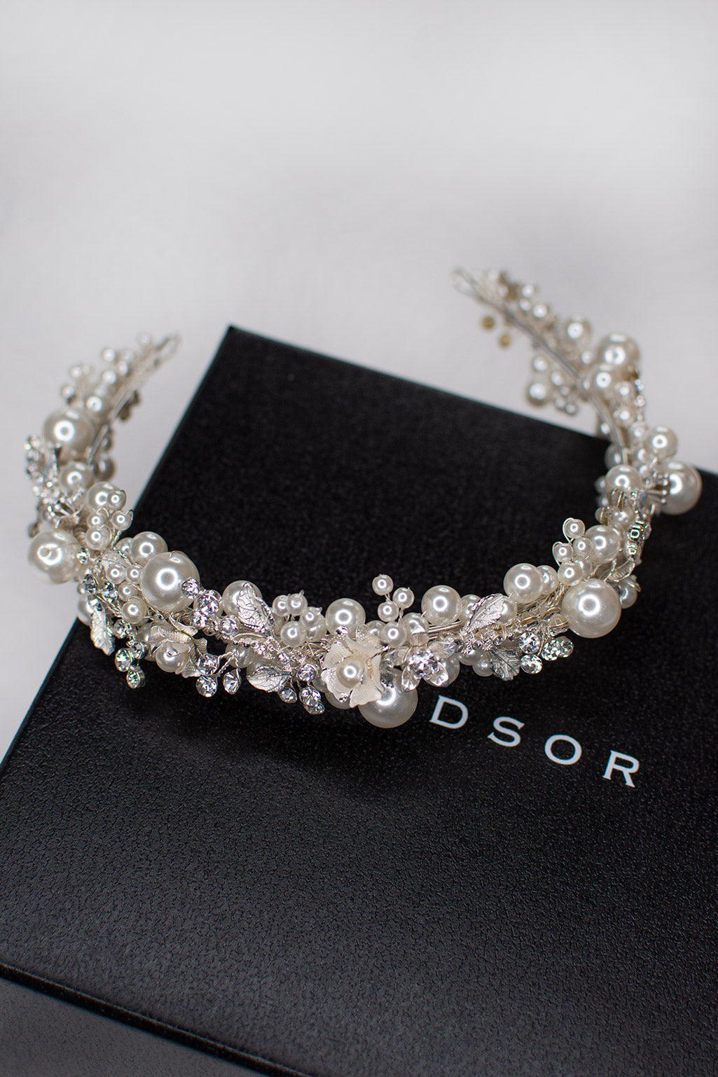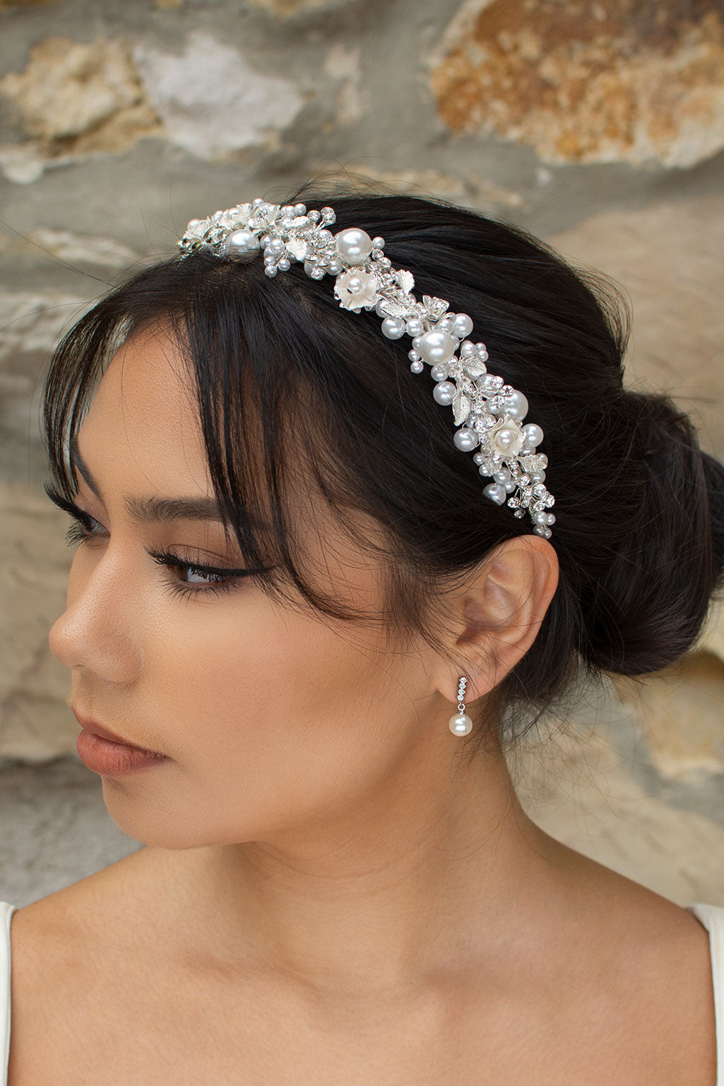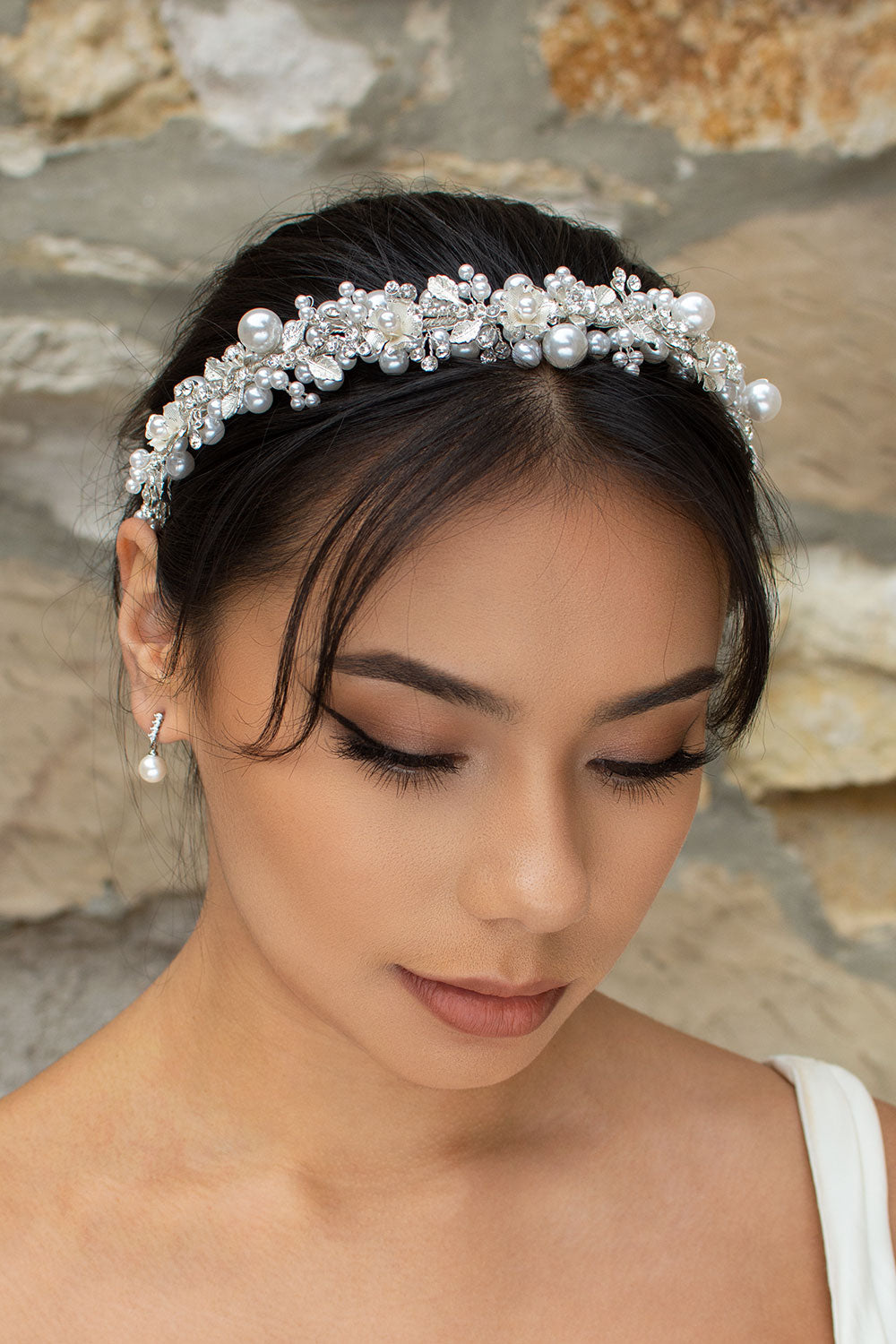 Wondrous Stella is an amazing Silver Pearl Headband that illuminates the room. Feel like the most exquisite bride wearing a piece that has been handcrafted with lustrous pearls and dazzling crystal stones. With subtle flower motifs, Stella is like a charming garland of pearls and leaves made with intricate detail. Stella is perfect to wear for long periods of time, causing no pain or headaches due to the frame's bendable nature. Soft and easy on the head, Stella is suitable for a range of bridal hairstyles. Become the bride of your dreams with Stella.
