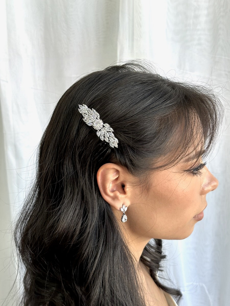 Sylvie is that perfect quality small comb that is going to take you from simply a lovely Bride to an elegant and stylish Bride. Use Sylvie at the back of the head or at the side. This beautifully made comb slides effortlessly into your hair. Each crystal is in an open back setting that means the look of the piece is enhanced as the light passes through.