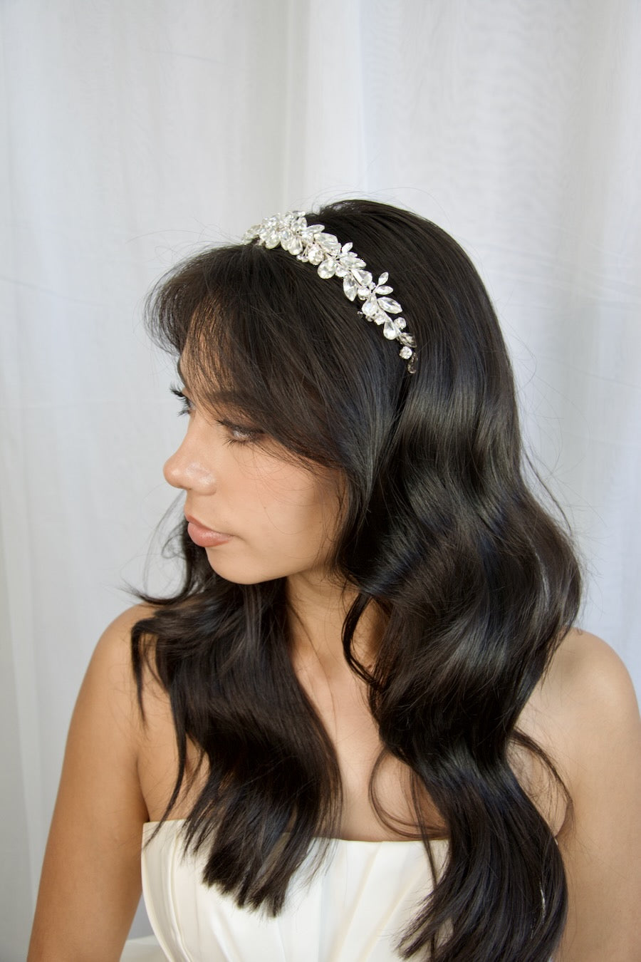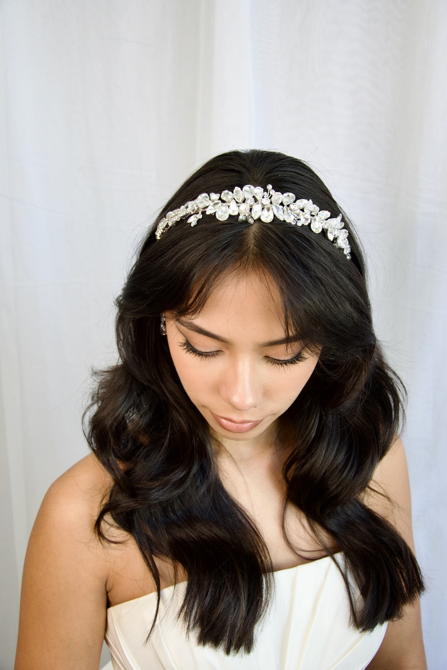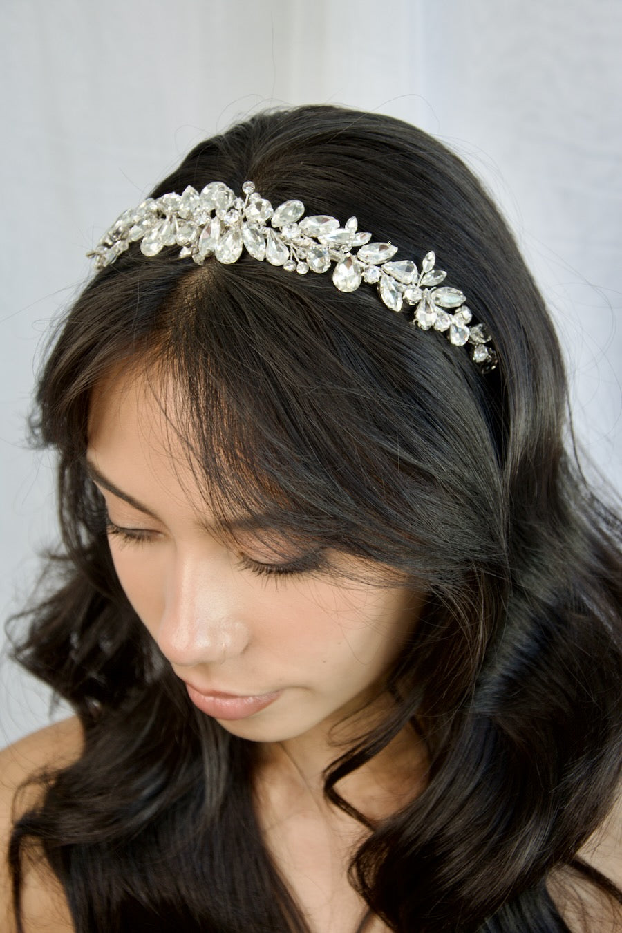 A beautiful band of bright crystal to make you the stunning Bride on your wedding day. Trista is a lightweight graduated crystal Bridal headband with Pear shape drops and Navettes and Chatons all on soft adjustable silver frame. Wear Trista close to your head or tilt her up a little depending on your hairstyle. Trista is also made as double row the Trista Double