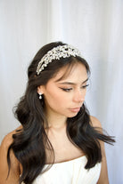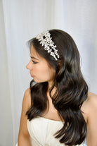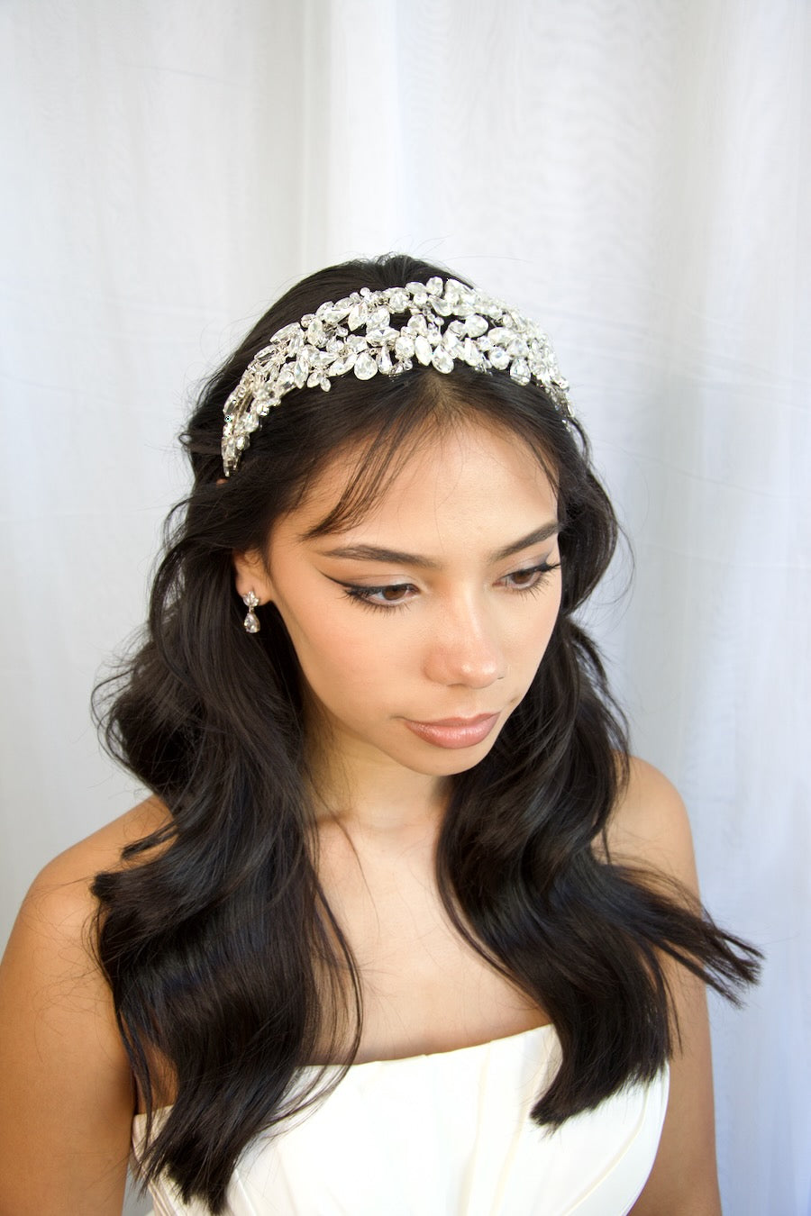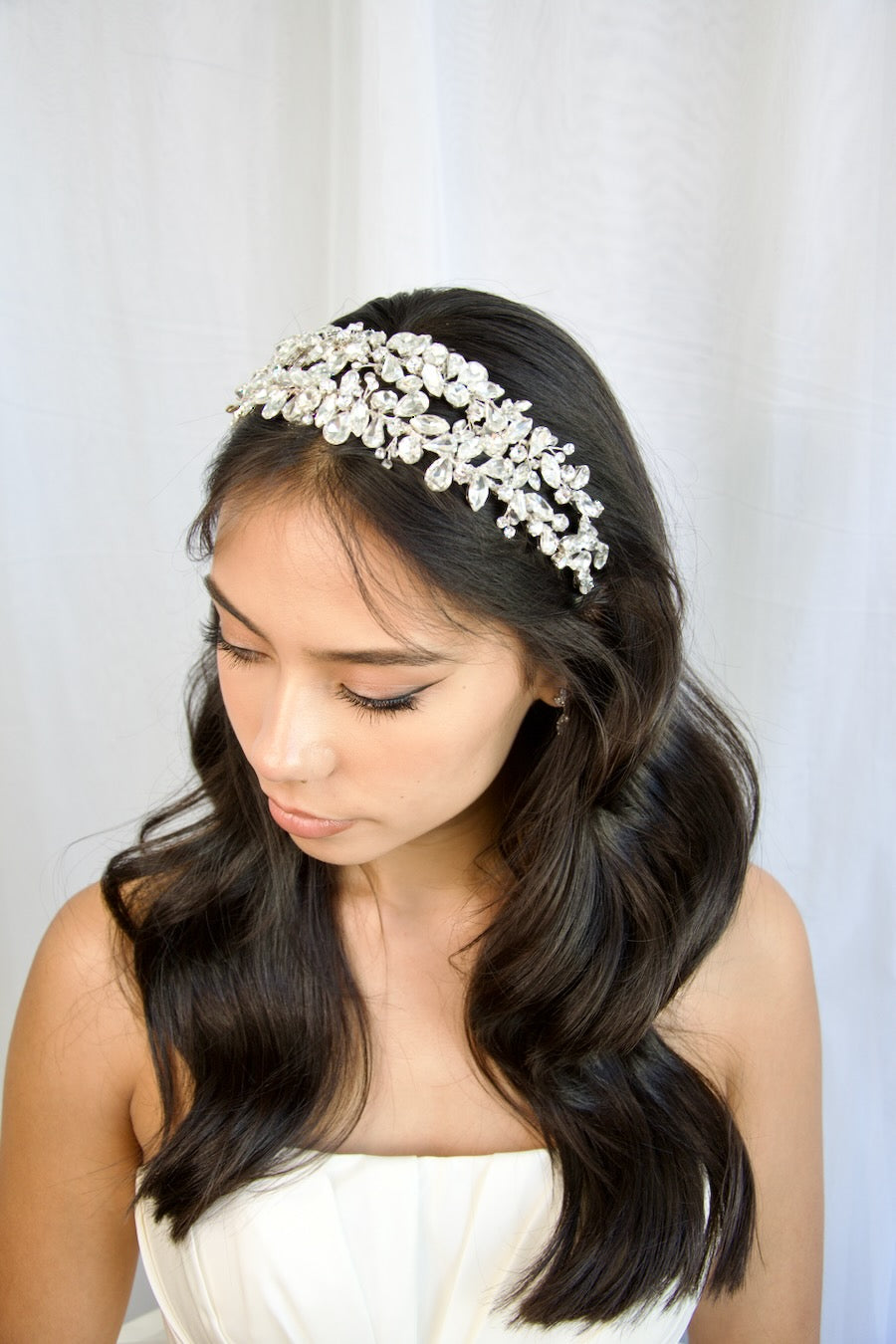 A beautiful twin band of bright crystal to make you the stunning Bride on your wedding day. Trista is a lightweight double row Bridal headband with Pear shape drops and Navettes and Chatons all on soft adjustable silver frame. Wear Trista Double close to your head or tilt her up a little depending on your hairstyle. Trista is also made as single row.