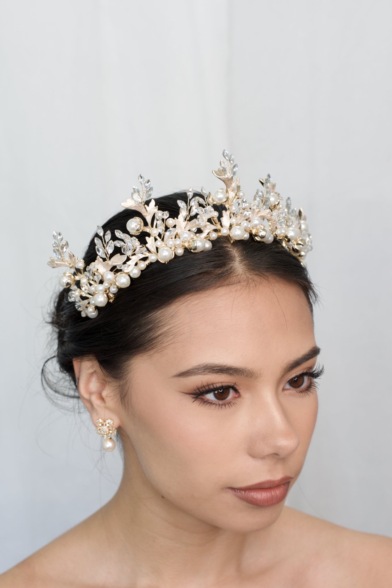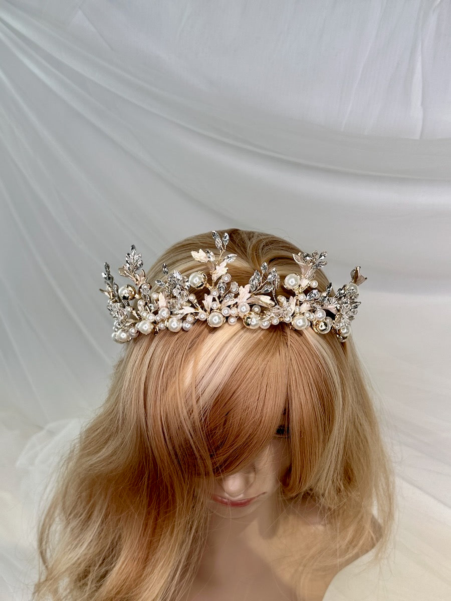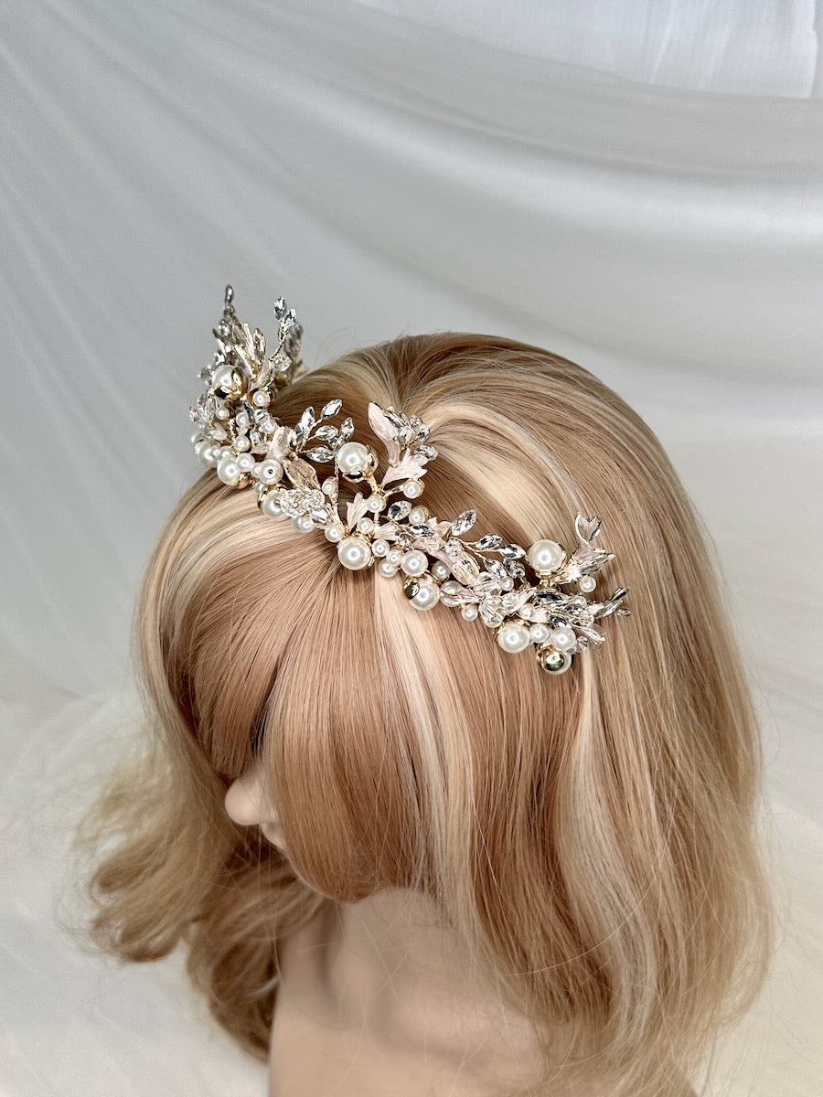 Vienna is a statement headpiece for a confident modern Bride. Pearls are cupped in pale gold cornucopia and raised up by soft gold swirls with sprigs and clusters of crystal. Five detailed motifs stand up from the flexible frame which is so easy to adjust and so comfortable to wear. Handmade in our Australian studio Vienna is a unique and distinctive bridal headpiece to crown the head of a truly lovely Bride.