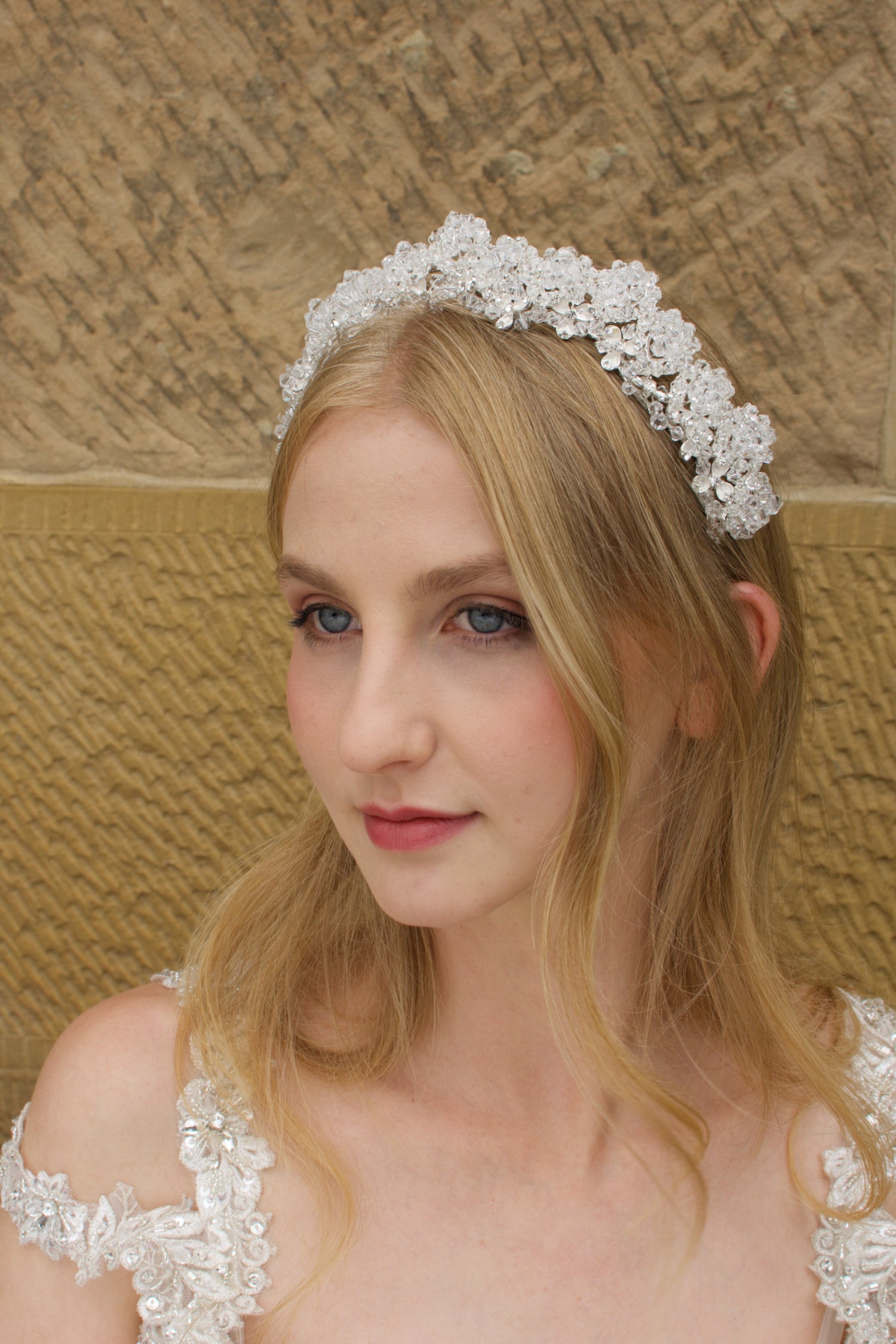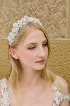Winona is a brilliant bow of crystal mastery that glistens and throws rainbows in the sunlight. With silver crystal swathes adorning the hairline, you won’t find a design that delivers more subtle elegant gleam than this. Winona is the one to walk you down the aisle in fairytale style on your special day.