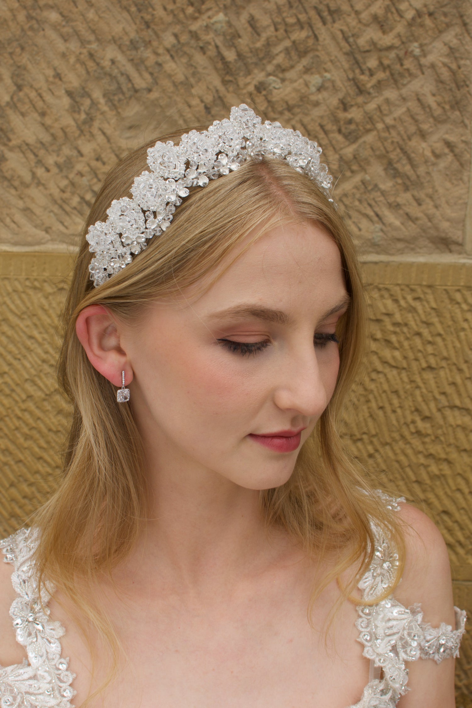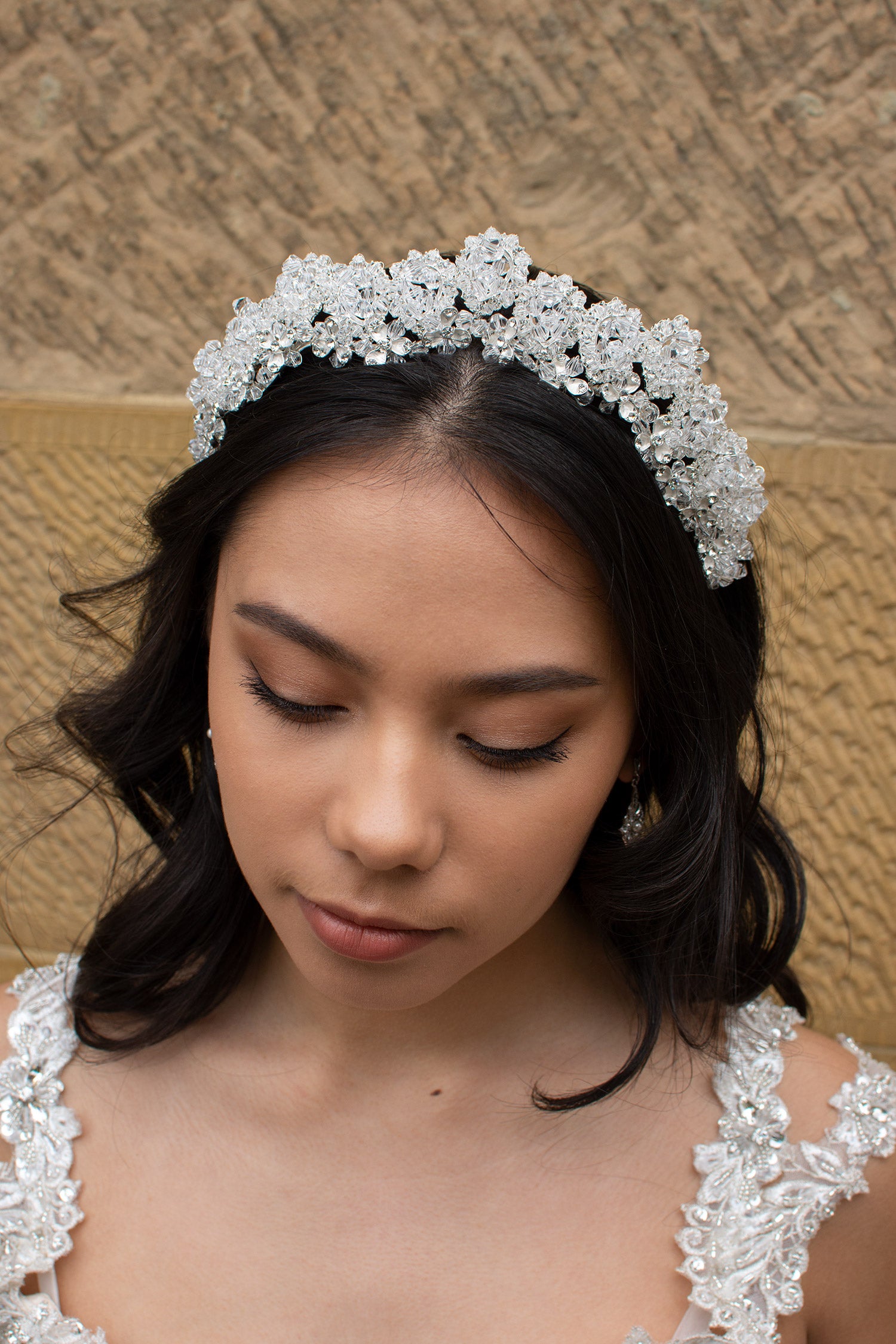The Winona Crown arches its crystals over your head, forming a magnificent wide crown. Winona is a showstopper and glistens rainbows in the sun. This Handmade delight is a wonderful shape, flattering on the head and fits like a headband over the ears. Our brass crown bands are strong yet bendable and hold no tight spring in the arch, ensuring comfort for all day wear. Winona is characterised by her pure use of quality crystal beads looped in teardrop sections from end to end. Small silver brass flowers decorate the base of the crown sitting comfortably on the head. Winona is an incredible piece. She matches perfectly with satin dresses to add a sparkly statement or wear her with a crystal detailed dress to complete your look.