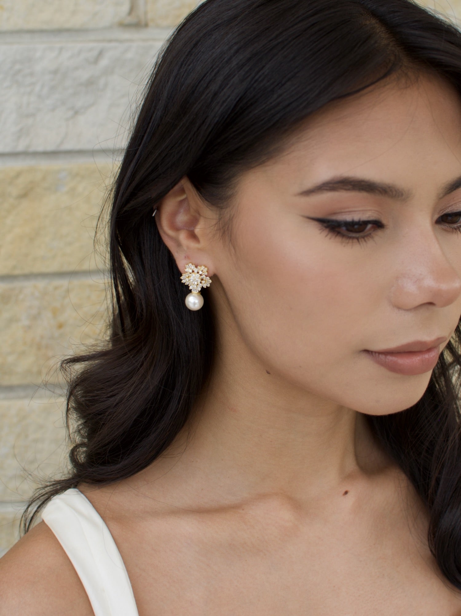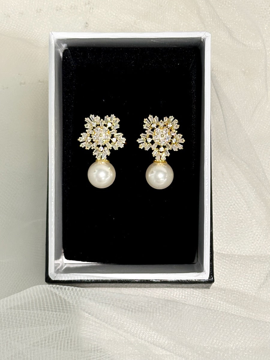 Zoe is a beautiful pale gold stud earring detailed with quality tiny baguette shaped stones in a stunning snowflake formation with a single gleaming pearl resting below. Zoe is perfect for those who do not want a long drop statement earring but are after something just as extravagant. Zoe earrings are also available in Silver.